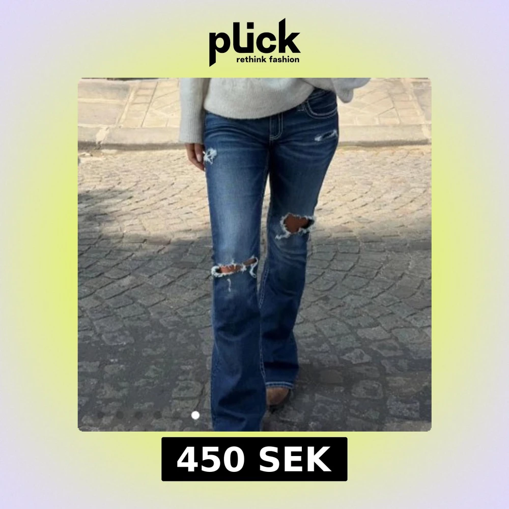Slutsålda från gina. Använda max 3 gånger! Snygga blå bootcut jeans med slitna detaljer och hål på knäna. Jeansen har kontrastsömmar och dekorativ broderad bakficka. Tillverkade i klassiskt denimtyg.