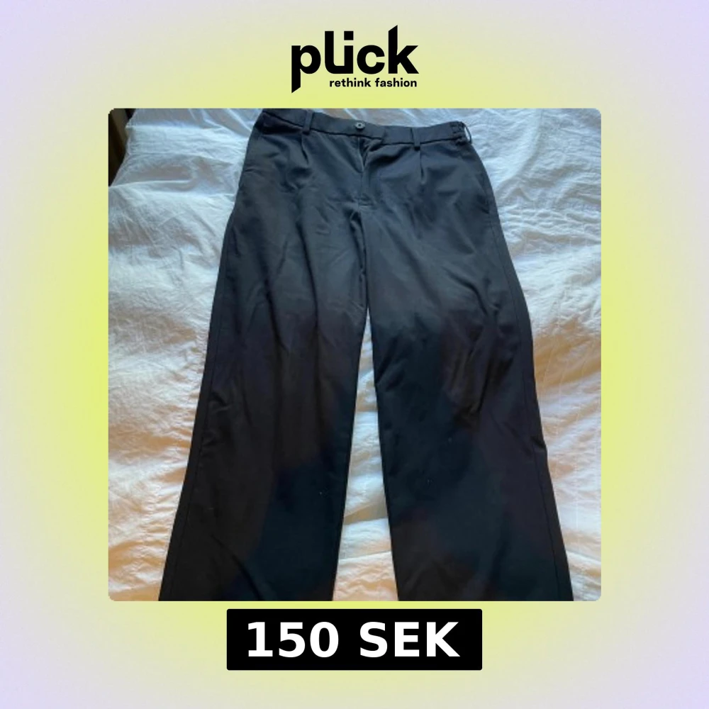 Svarta kostymbyxor från Uniqlo i storlek S. Byxorna har raka, vida ben och hällor för bälte. Tillverkade i en mjuk blandning av polyester, viskos och elastan för en bekväm känsla. Perfekta för en clean och stilren look. Svårt att se på bild men de är mörkblåa.