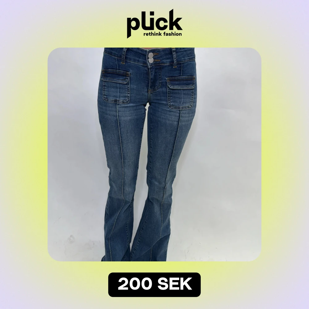 Snygga blå bootcut jeans i mycket bra skick. De har en låg midja och coola fickdetaljer fram. Perfekta för både vardag och fest! Passar till allt från sneakers till klackar.
