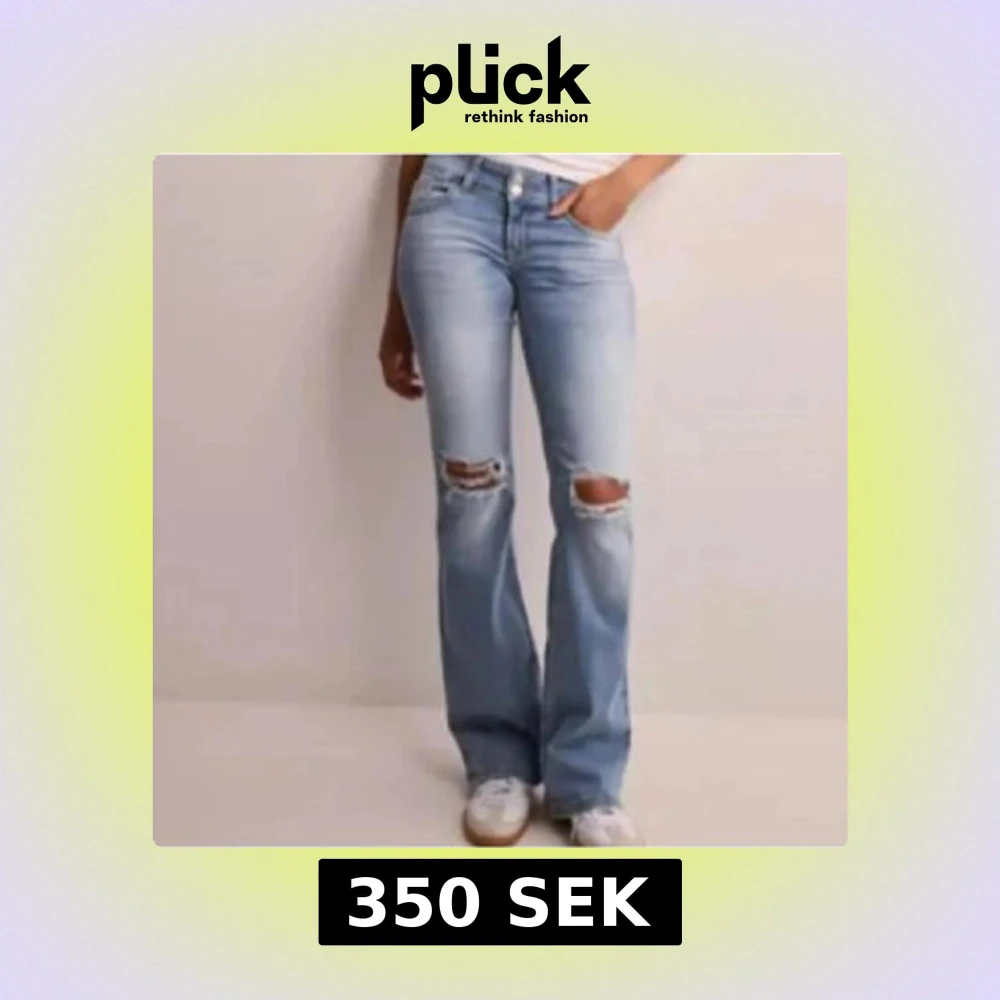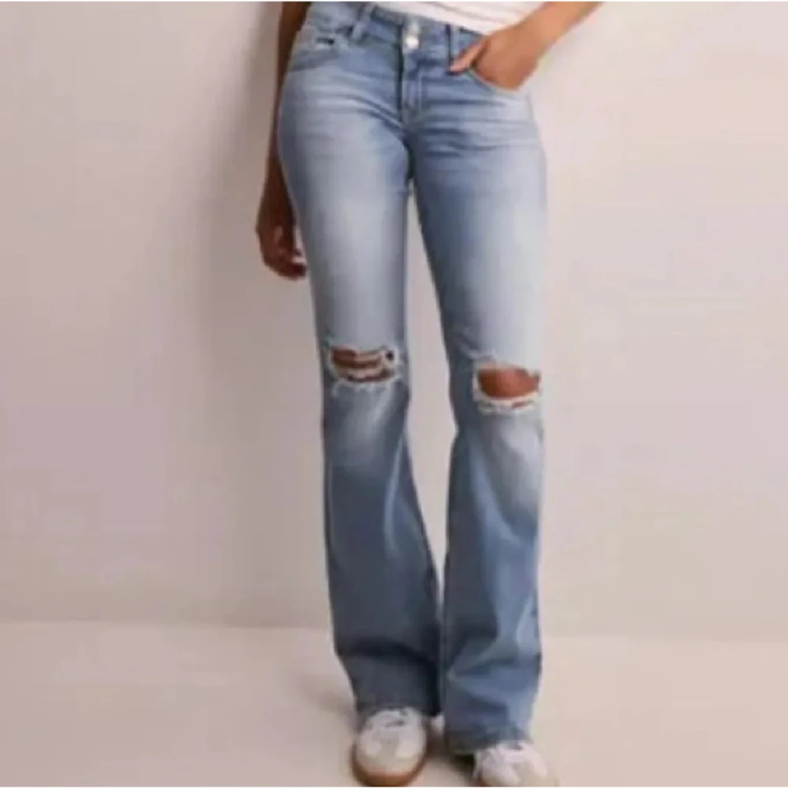 Snygga ljusblå jeans med bootcut-modell och slitna hål på båda knäna. Jeansen har klassisk femficksdesign, hög midja och är tillverkade i denim. Perfekta för en avslappnad och trendig look.