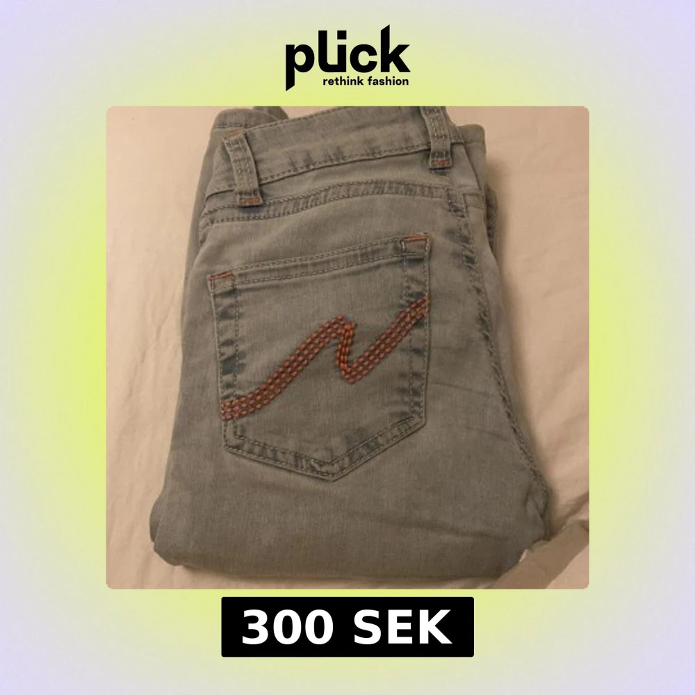 Säljer ett par ljusblå jeans från Nelly med klassisk femficksdesign och orange broderi på bakfickan. Jeansen har en snygg slitning på benet och är tillverkade i mjukt denimtyg. Passar dig som gillar en avslappnad och trendig look.