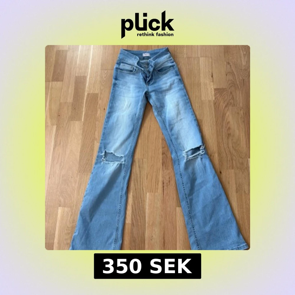 Snygga ljusblå bootcut jeans från Nelly med slitna detaljer på båda knäna. Modellen har klassisk femficksdesign och är tillverkad i mjukt denimtyg. Perfekt för dig som gillar en avslappnad och trendig look.