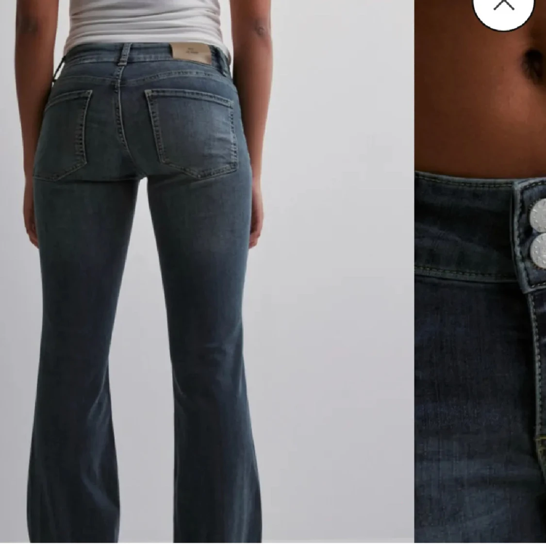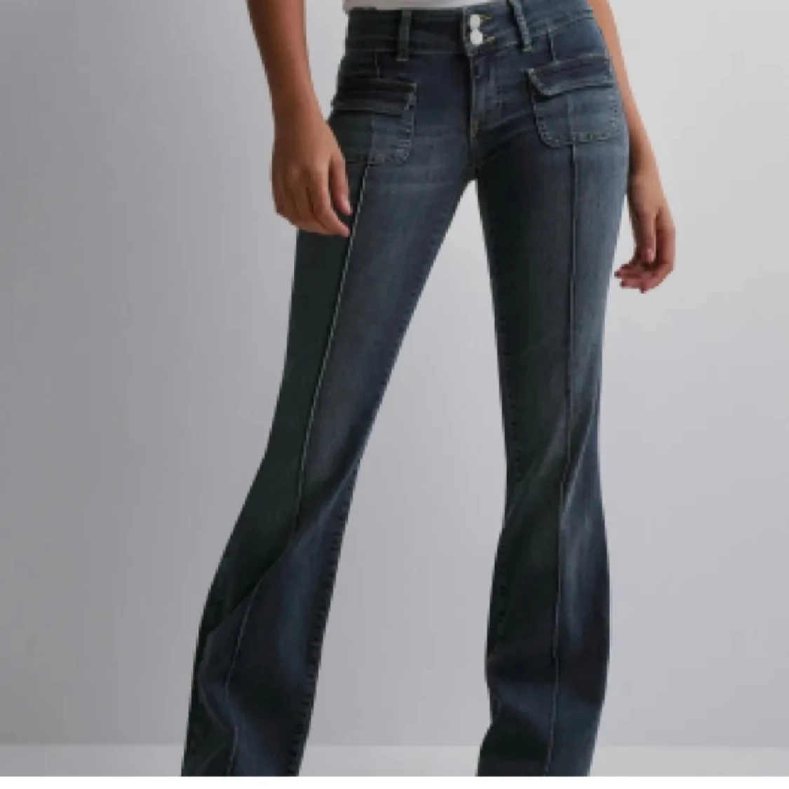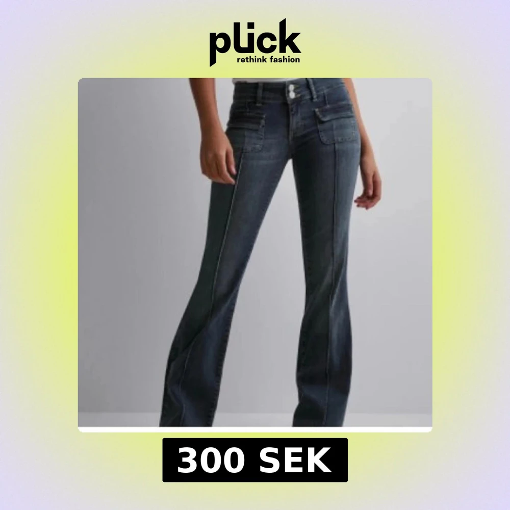 Snygga mörkblå bootcut jeans med låg midja. Slutsålda och säljs inte längre på hemsidan. Liten defekt på en sidan av jeansen längst upp då flärpen som ska hålla vid ett bälte är lite av