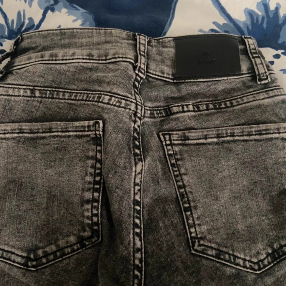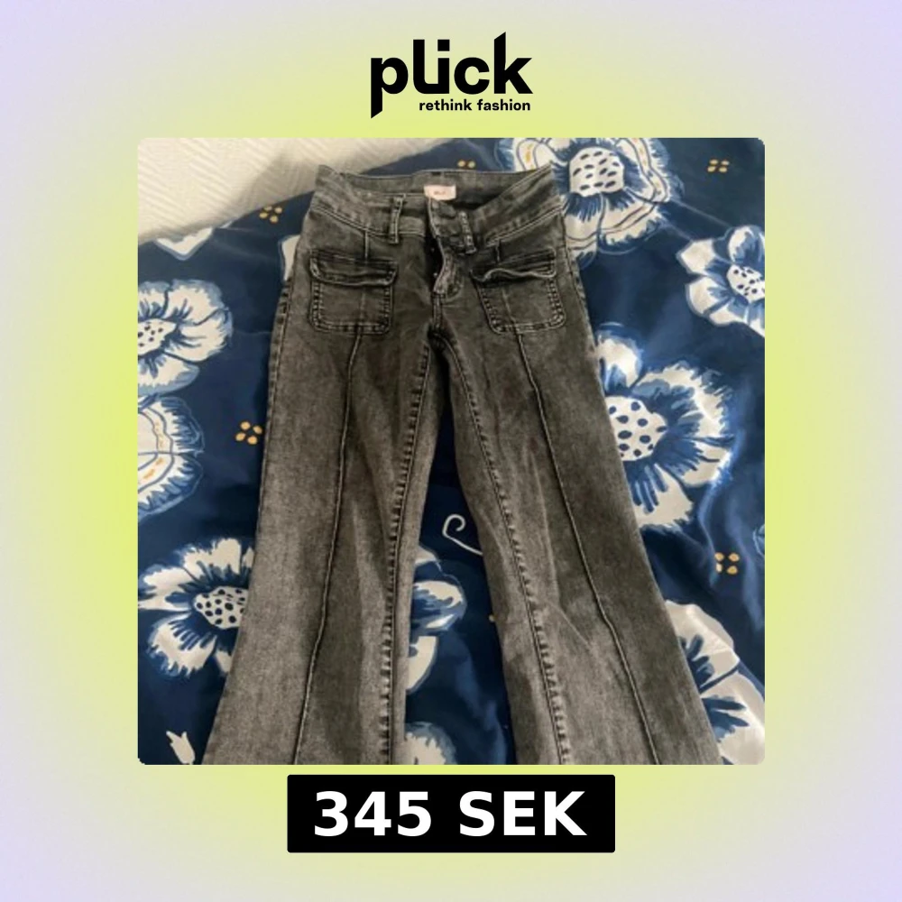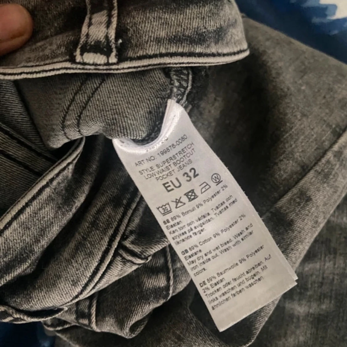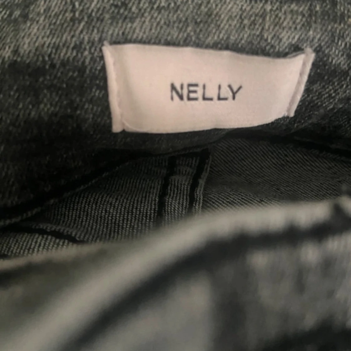 Snygga grå bootcut jeans från Nelly med låg midja och stora fickor fram. Använd en gång