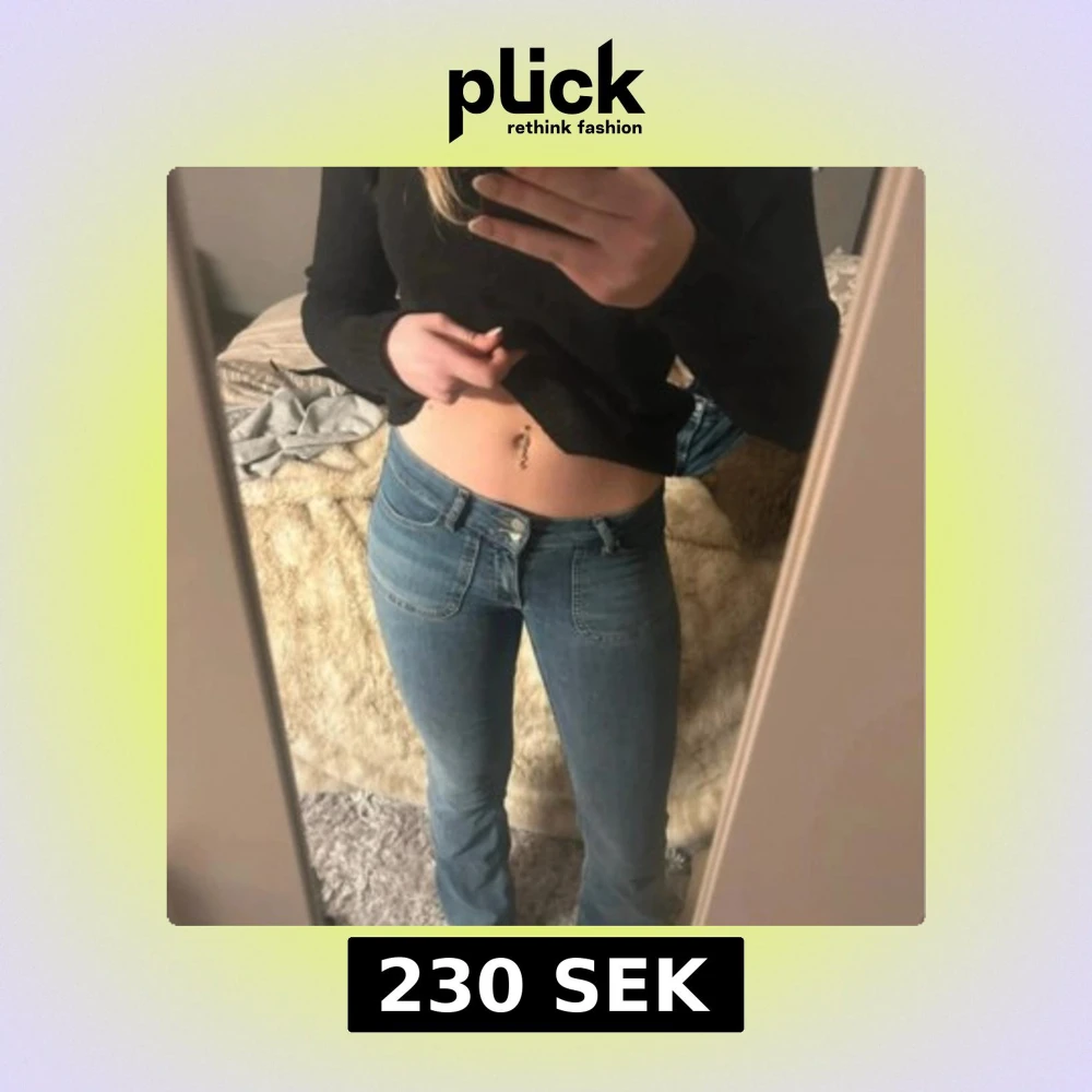 Säljer ett par ljusblå jeans med bootcut-modell och stora fickor med knapp bak. Jeansen har låg midja och klassisk jeanslook med snygga sömmar och bälteshällor. Perfekta för dig som gillar en retro vibe och vill ha något som sticker ut lite extra.
