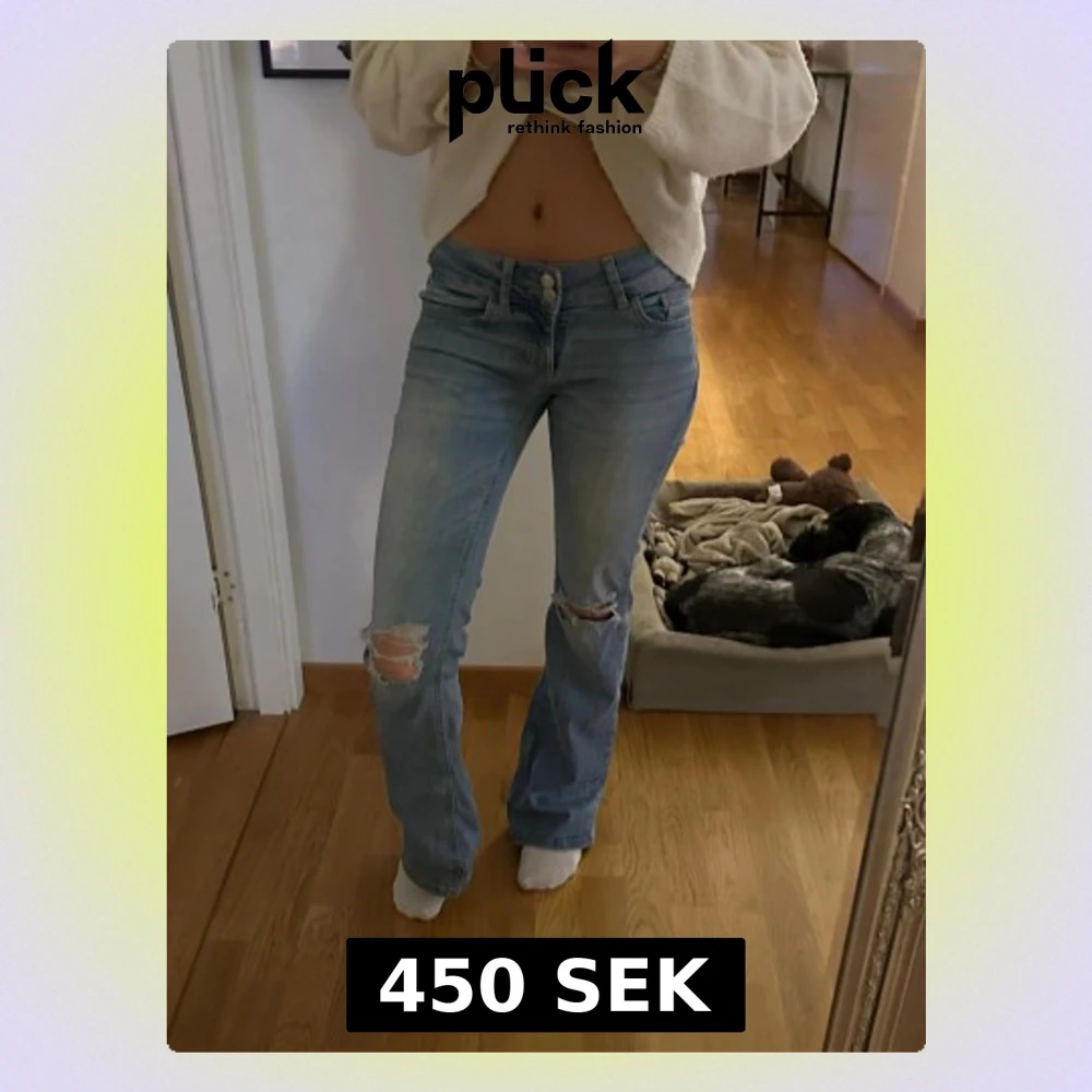 Säljer ett par ljusblå jeans med bootcut passform och låg midja från Nelly. Storlek 34, mycket fint skick men lite slita längst ner men inget som man tänker på. Är 164 cm lång. Nypris 700kr