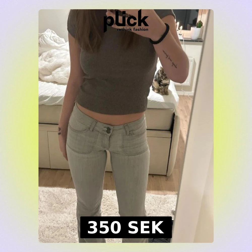 Säljer ett par ljusgrå jeans med bootcut-modell från Nelly. De har snygga fickdetaljer både fram och bak. Byxorna har låg midja och är utsvänga. 💘