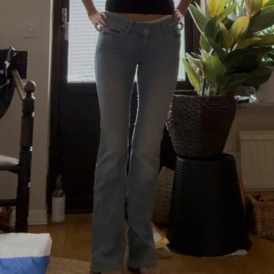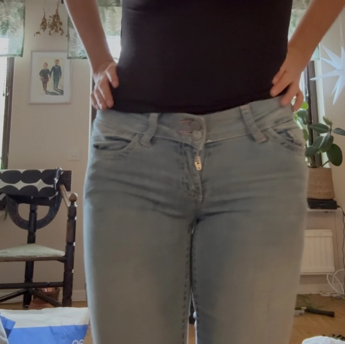 Säljer ett par ljusblå jeans från Nelly med bootcut passform och låg midja. Jeansen har snygga rosa detaljer på bakfickorna och dubbla knappar framtill. Klassisk femficksmodell i stretchig denim som sitter tajt upptill och släpper vid bensluten.