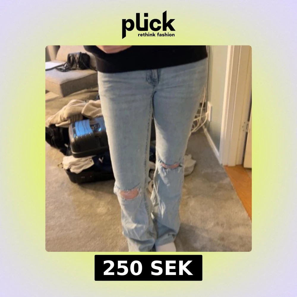 Säljer ett par ljusblå jeans från Nelly med slitna knän och raka ben. Jeansen har coola orange broderade detaljer på bakfickorna och klassisk femficksdesign. Perfekt för dig som gillar en avslappnad och trendig look.
