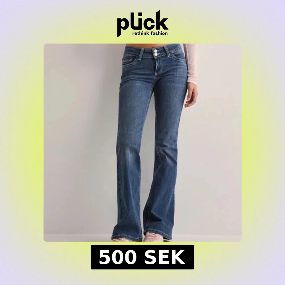 Snygga blå bootcut jeans med klassisk femficksdesign och knappgylf. De har en stilren passform som sitter bra över höfterna och släpper ut vid benen. Perfekta för en avslappnad look. Storlek 34💕