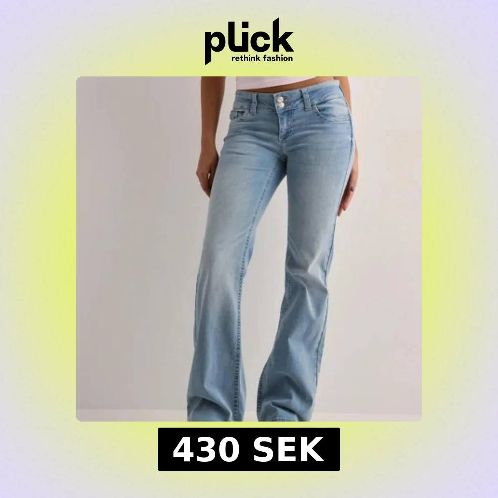 SÀljer ett par ljusblÄ bootcut jeans frÄn Nelly med fina rosa sömmar pÄ bakfickorna. Jeansen har lÄg midja och Àr tillverkade i mjukt denimtyg med lite stretch.