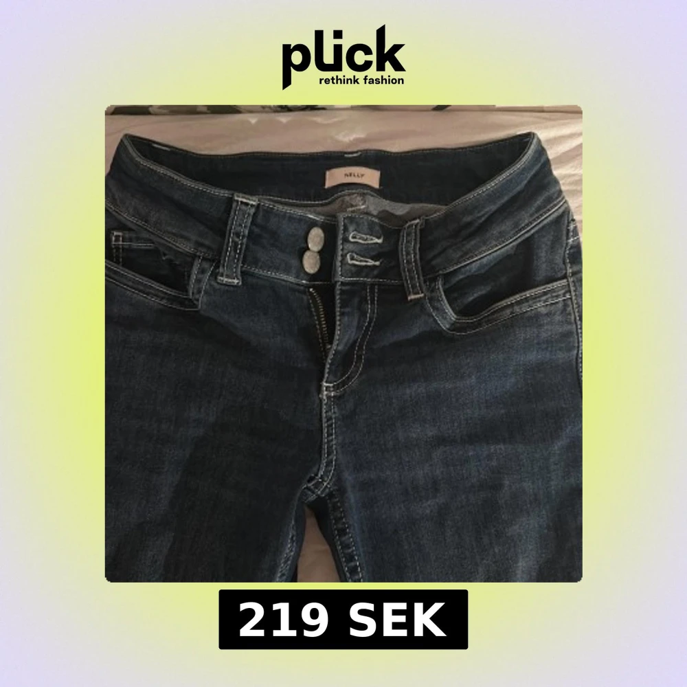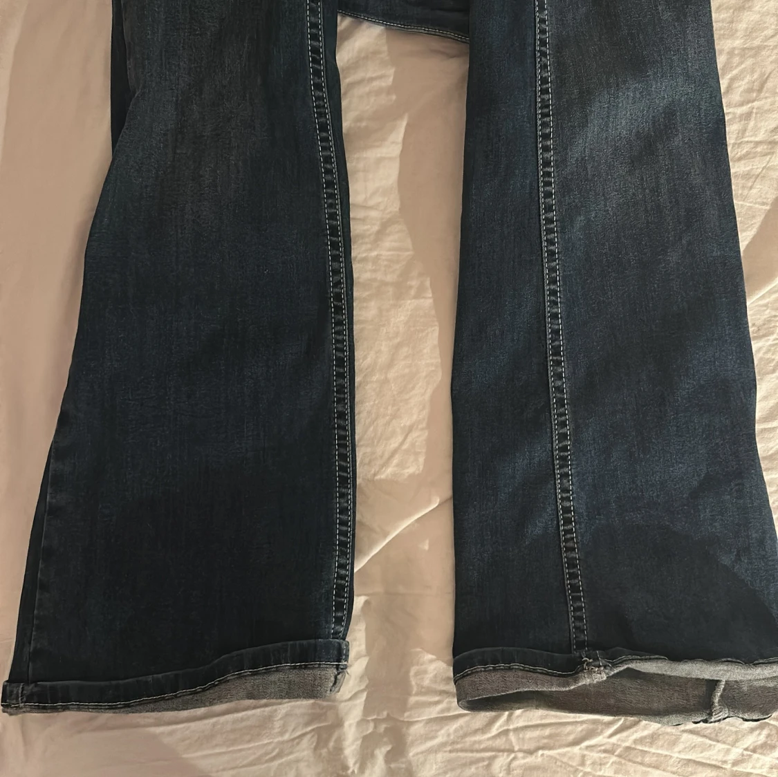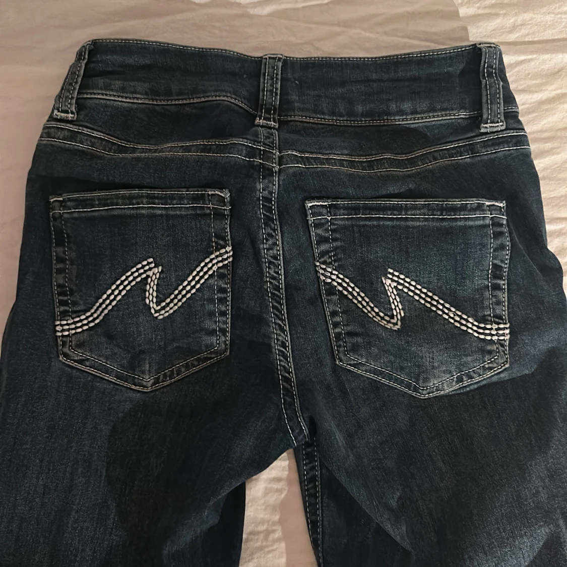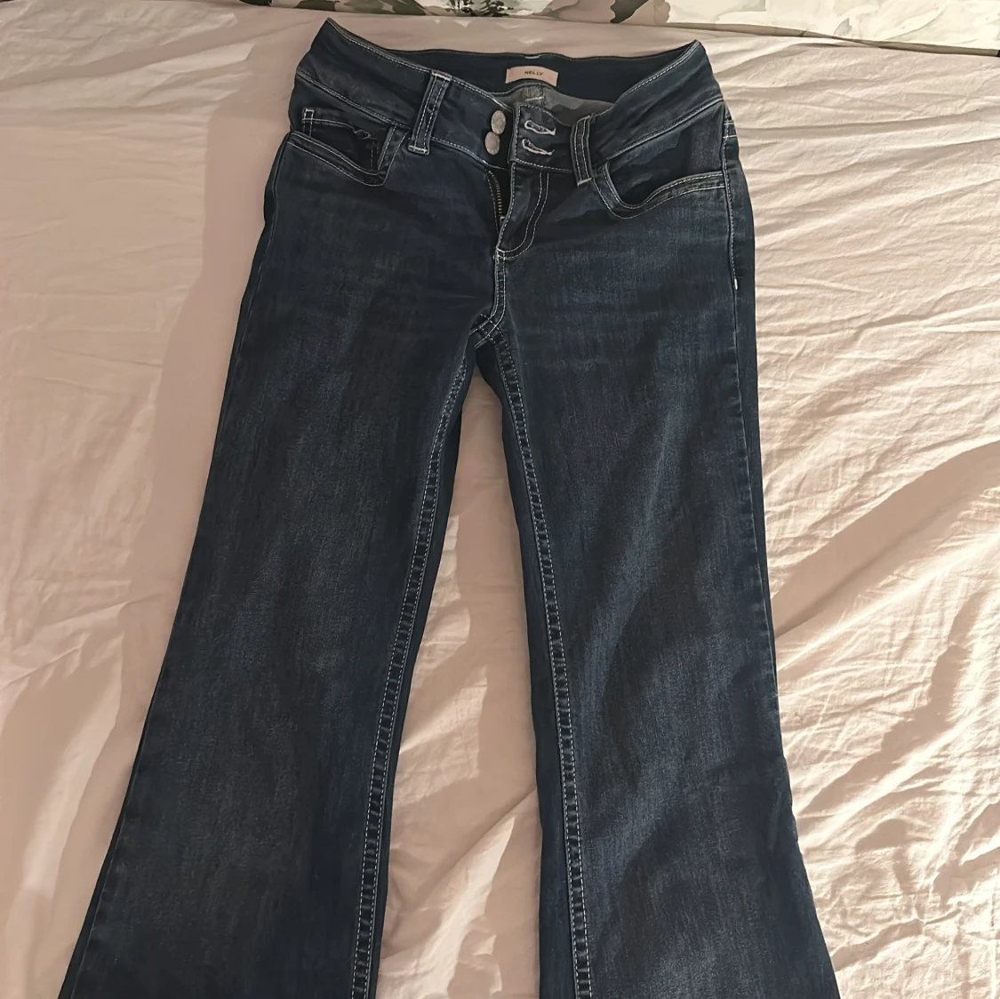 Snygga mörkblå jeans från Nelly med bootcut passform och låg midja. Jeansen har vita kontrastsömmar, dubbla knappar i midjan och coola bakfickor med vit zigzag-detalj. Perfekta för dig som gillar en klassisk men trendig look. De är stretchiga i materialet och är väldigt bekväma att ha på sig. Har använt de några enstaka gånger men inget har slitits.