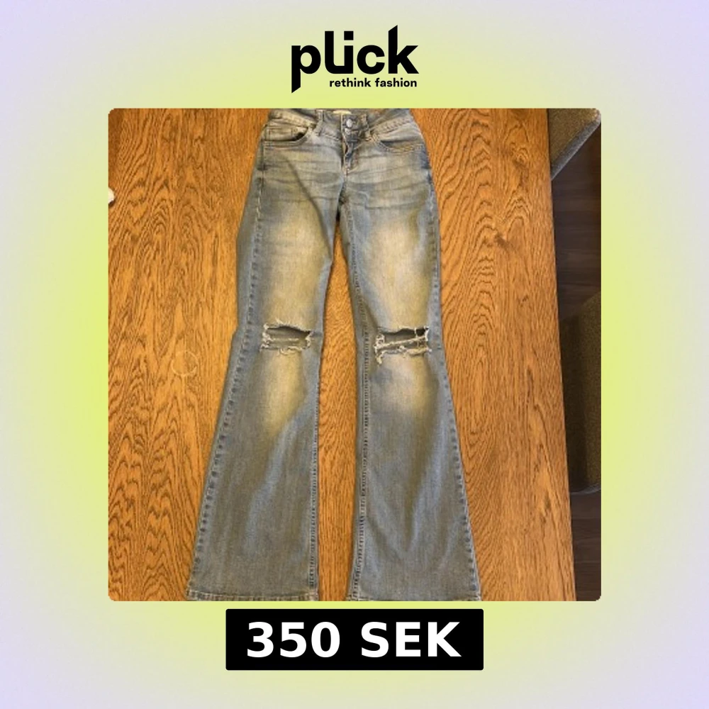 Snygga blå bootcut jeans från Nelly med slitna detaljer på knäna. Jeansen har låg midja och klassiska femficksdesign med knappar. Något slitna nere vid fötterna, annars bra skick. Nypris 700
