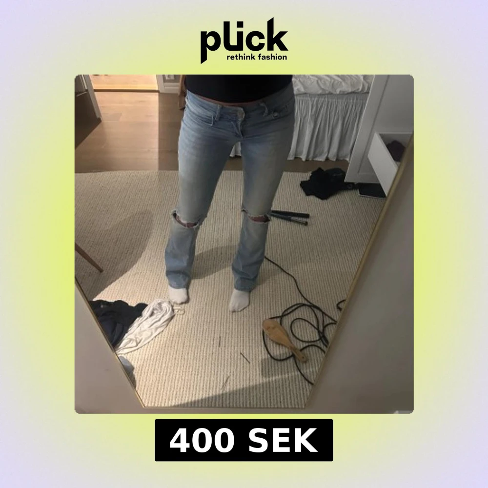 Säljer ett par ljusblå jeans från Nelly med bootcut-modell och slitna hål vid knäna. Säljer pga att de inte kommer till användning längre. Hålen har blivit större än när jag köpte dem, däremot är dem i ett fint skick!