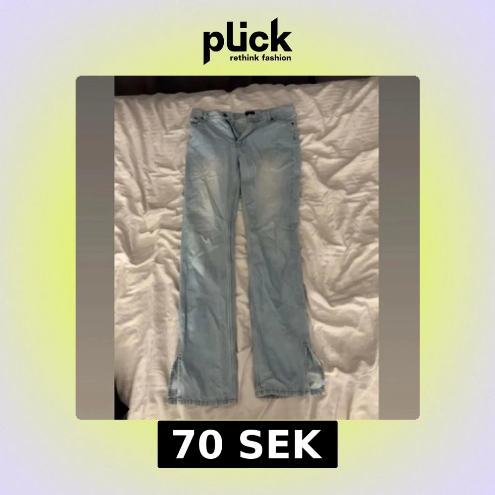 Säljer ett par ljusblå jeans med bootcut-modell och slits nertill på benen. Jeansen har klassisk femficksdesign och är tillverkade i denim. Perfekta för dig som gillar en avslappnad och trendig look.