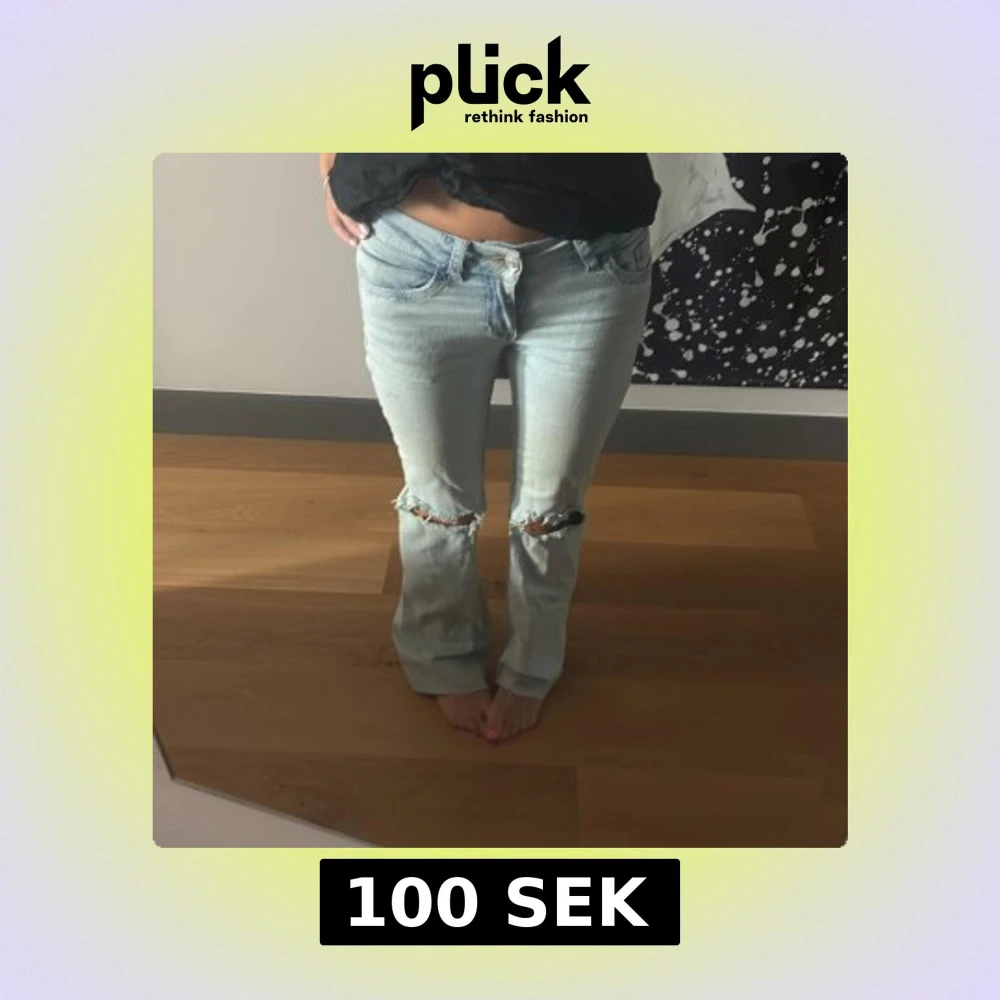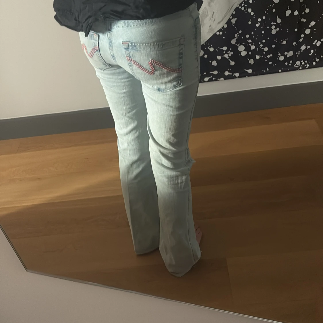 Säljer ett par ljusblå jeans med bootcut passform och slitna hål över knäna. Jeansen har klassisk femficksdesign och snygg broderad detalj på bakfickorna. Perfekta för dig som gillar en avslappnad och trendig look. Är lite ojämt klippan nertill men inget som syns, också några få fläckar, svaga, där av priset.