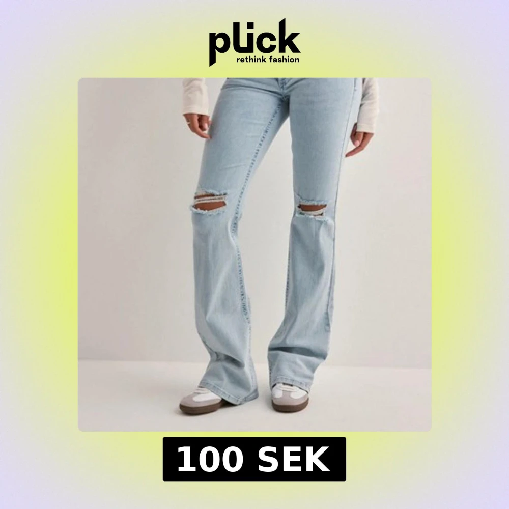 Säljer ett par ljusblå bootcut jeans med hål vid knäna med rosa detaljer på bakfickorna 💞