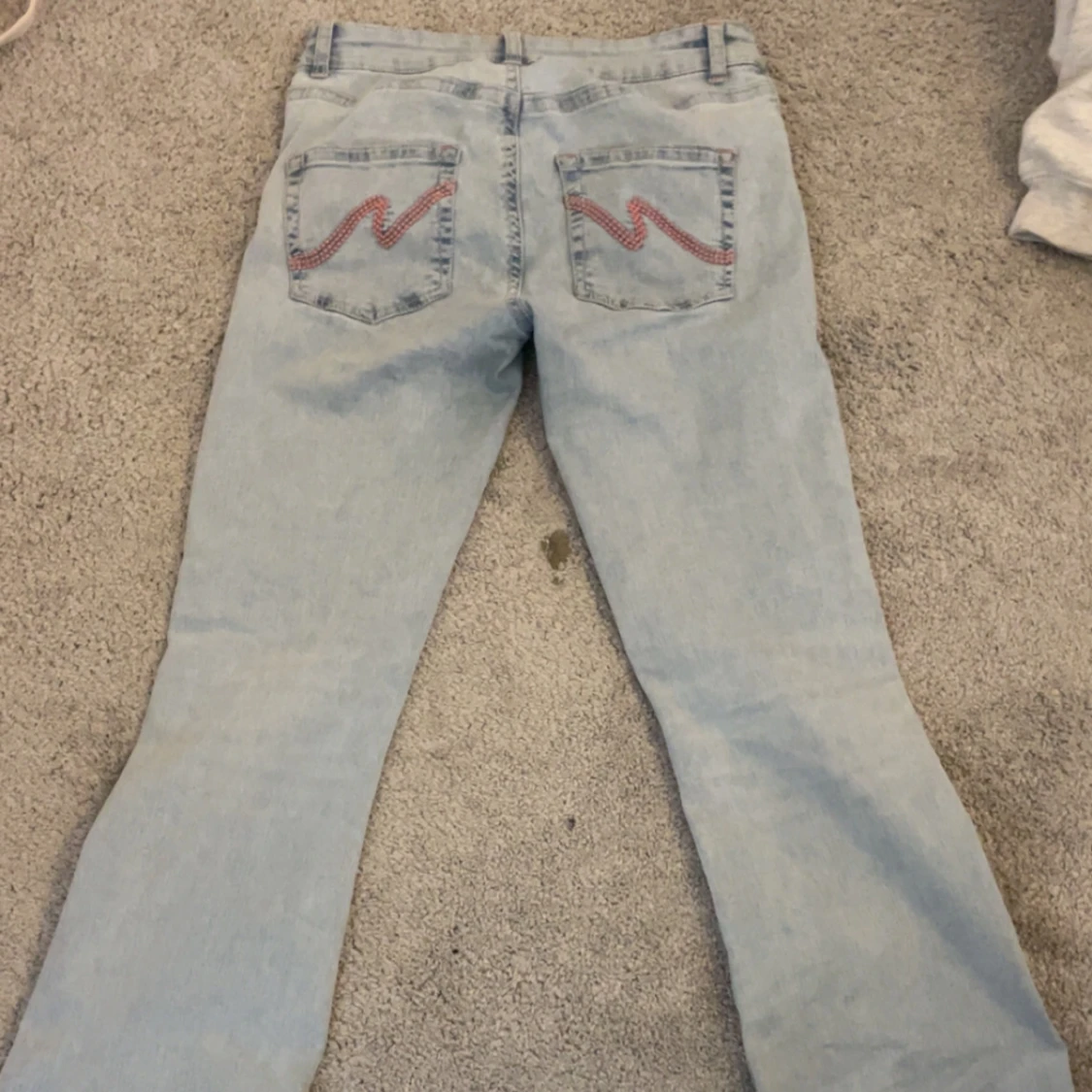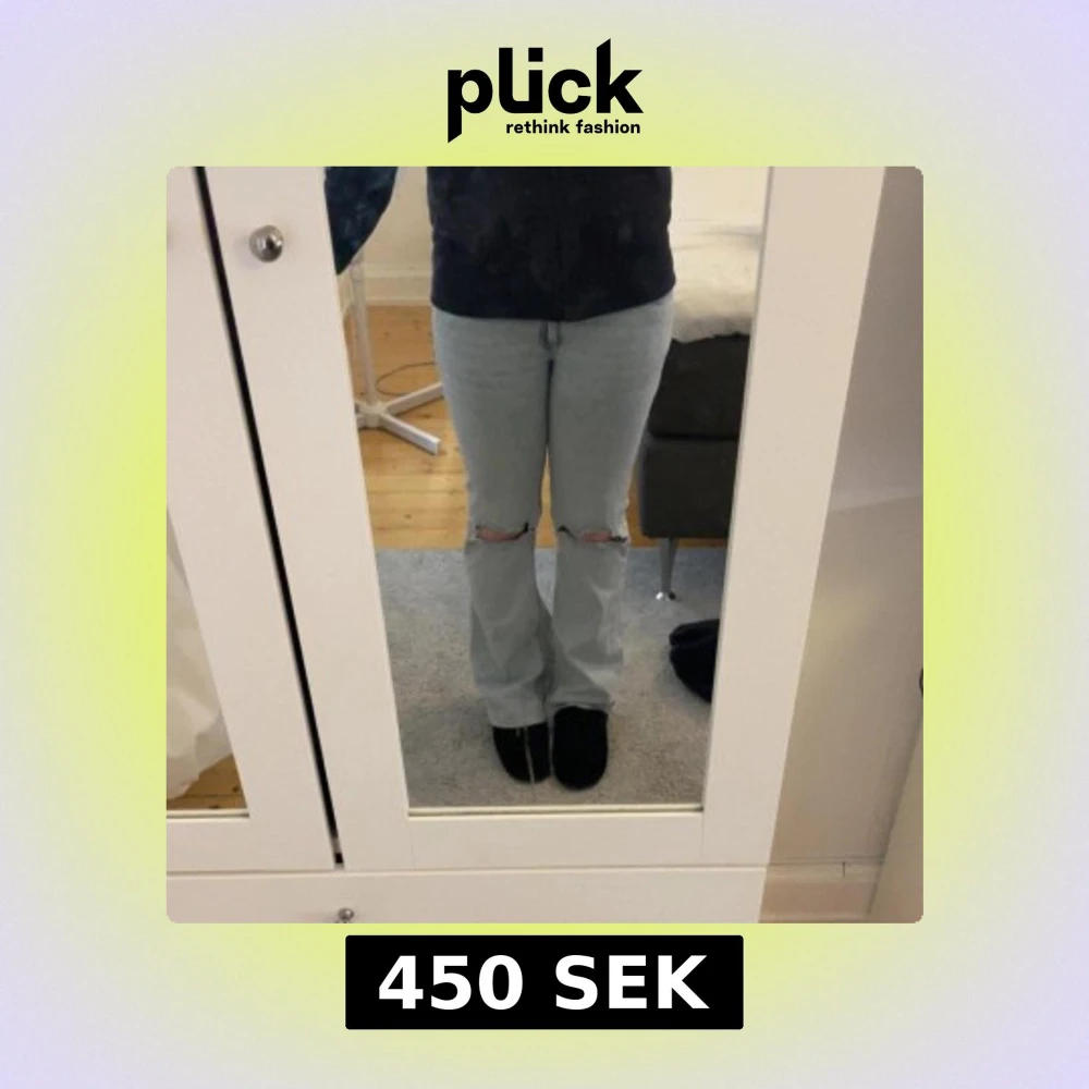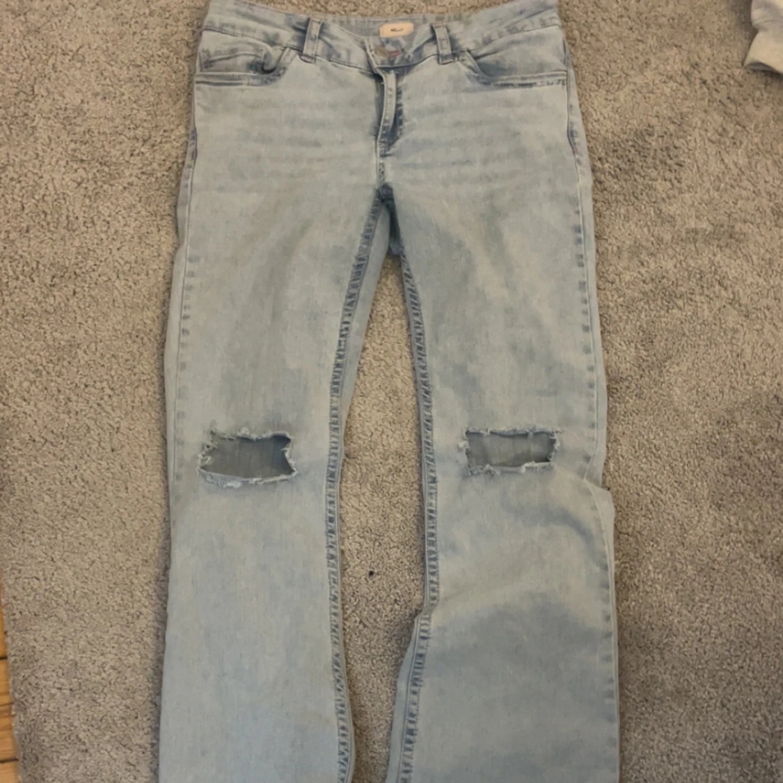 Säljer ett par ljusblå jeans med bootcut-modell och slitna hål på knäna. Jeansen har klassisk femficksdesign och coola broderade detaljer på bakfickorna. Sytt upp ungefär 5cm