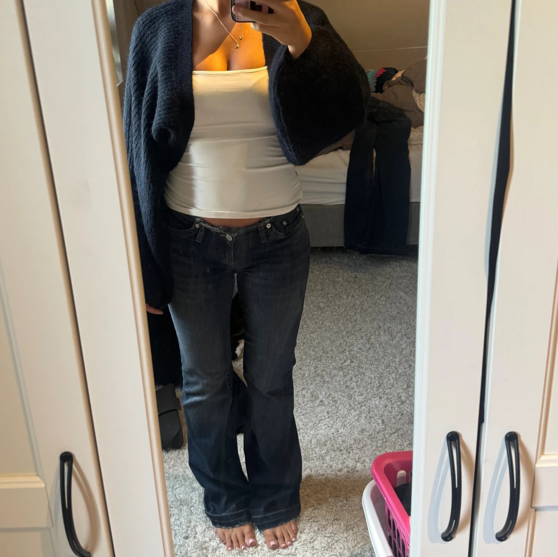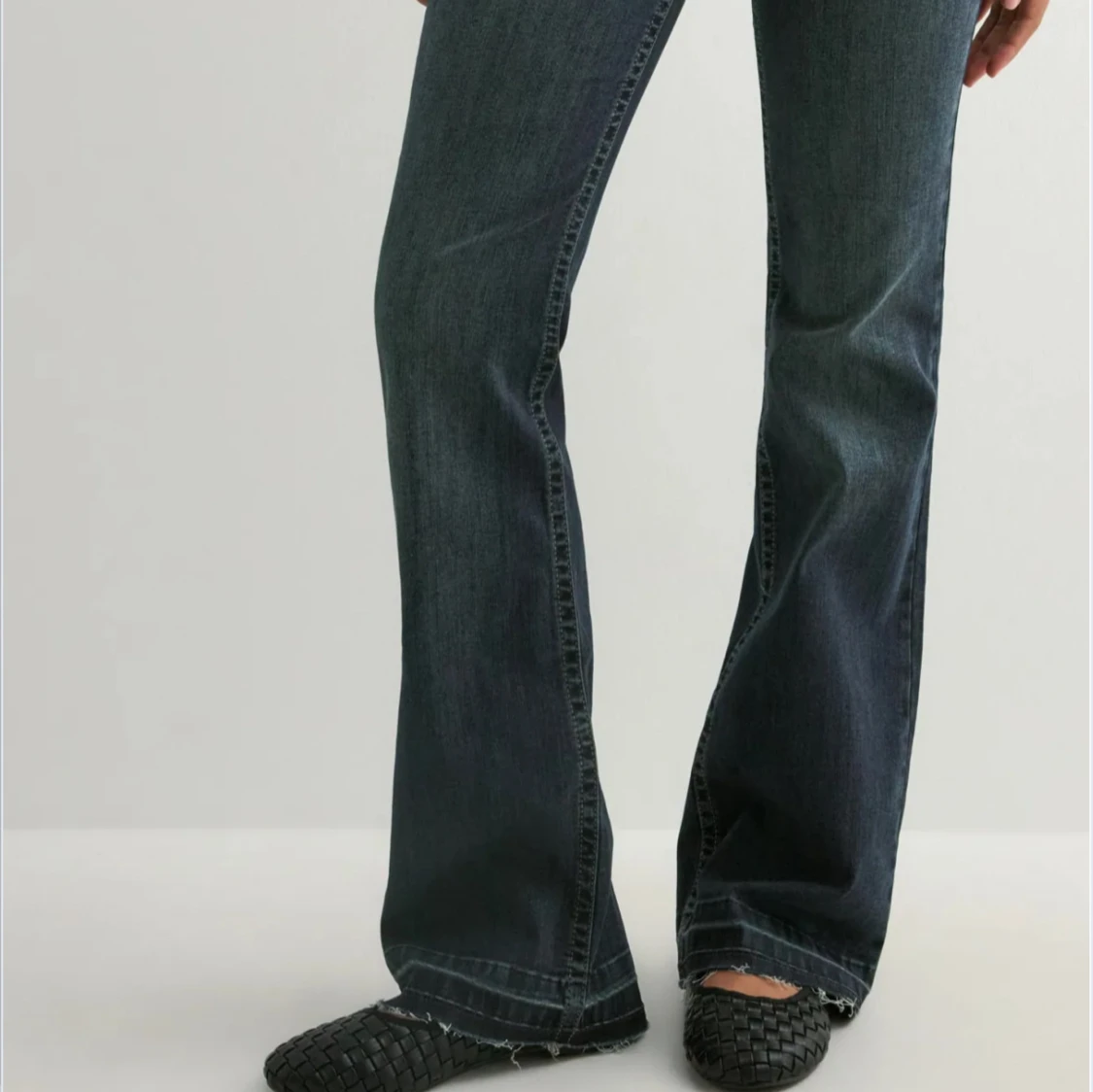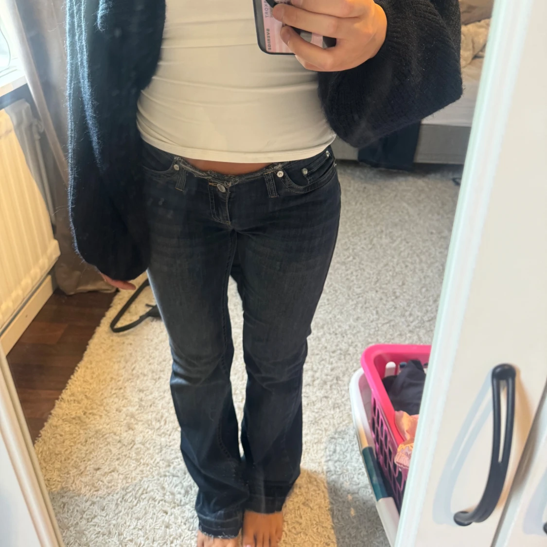 Säljer ett par mörkblåa bootcut jeans som är lågmidjade från Nelly. Jag köpte två storlekar och därför säljer jag dessa. Dem är helt oanvända och prislappen är kvar. Nypris är 700kr