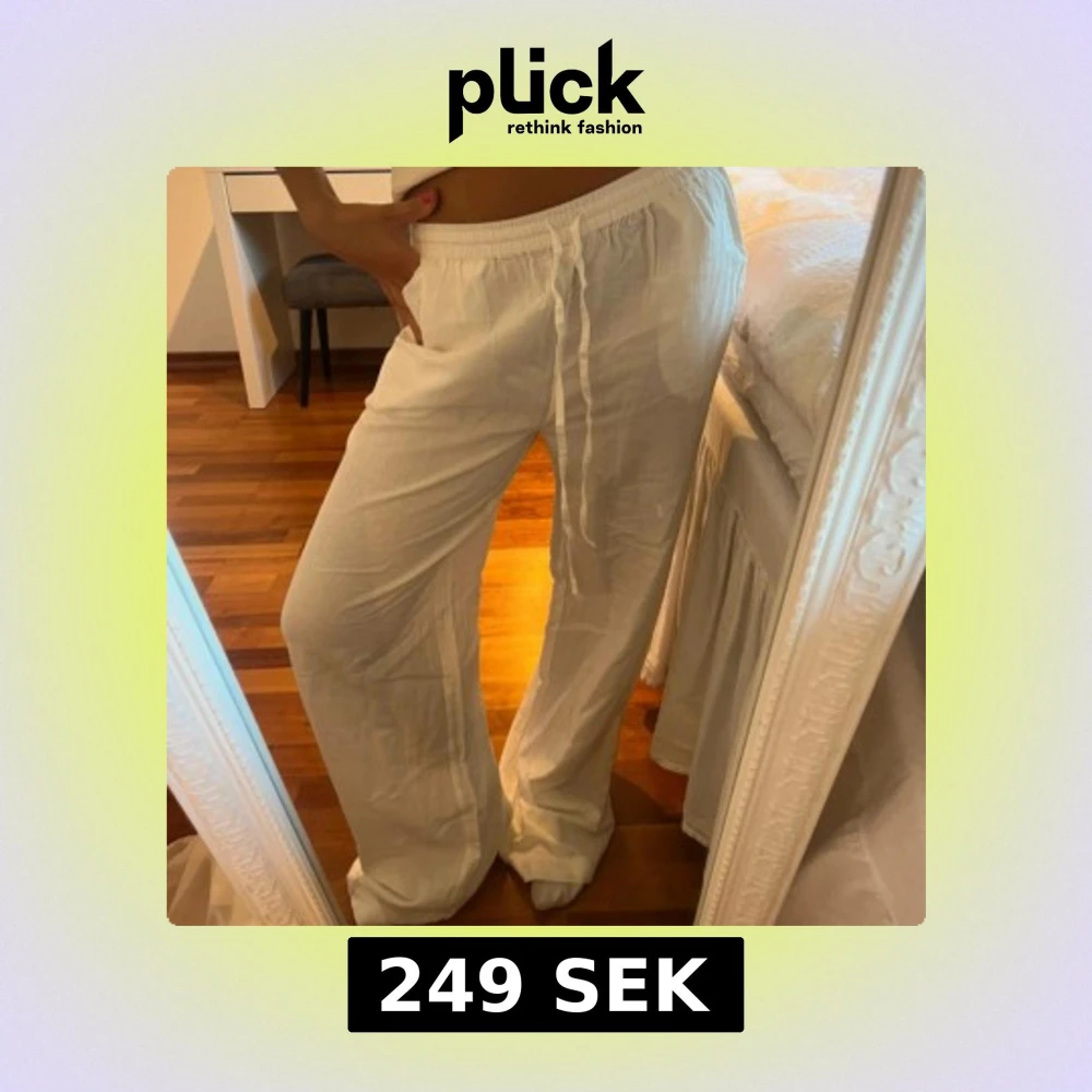 Säljer ett par vita linnebyxor från Nelly i storlek 34. Byxorna har en avslappnad passform med breda ben, resår i midjan och snörning framtill. Perfekta för en chill och luftig stil. Materialet är linne och de har fickor på sidorna.