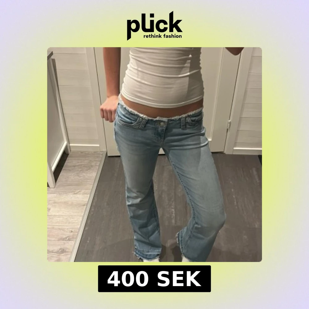 Säljer ett par ljusblå bootcut jeans från Nelly i modellen 'No Waist Bootcut Jeans'. De har låg midja, rå kant upptill och klassisk femficksdesign. Jeansen är i mjuk denim och har en avslappnad passform med utsvängda ben.