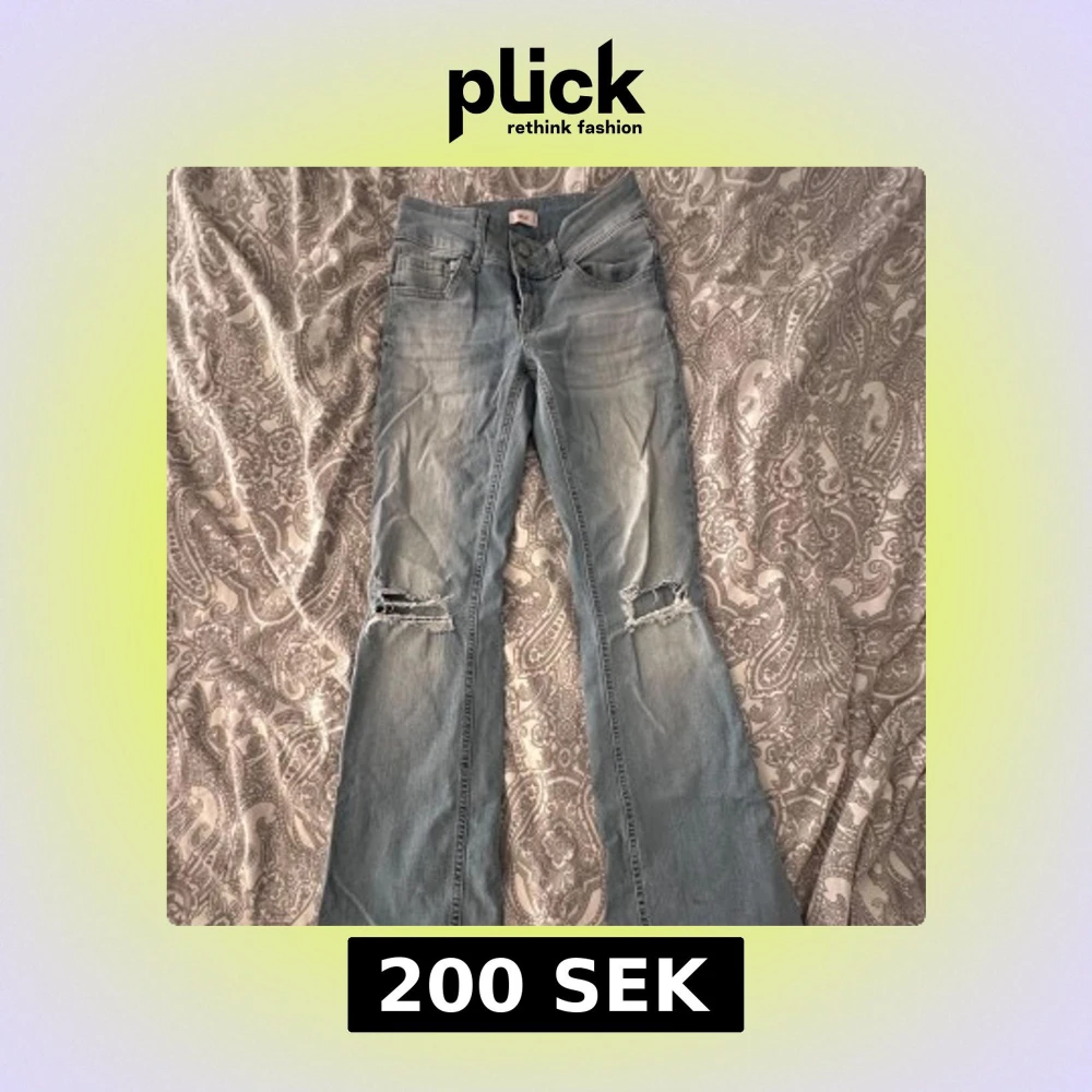 Bootcut jeans från Nelly i ljusblå tvätt med låg midja och coola slitningar över båda knäna. Baktill finns två fickor med lock och knapp. Jeansen har klassisk femficksdesign och är gjorda i mjukt denimtyg. Perfekt för dig som gillar retrovibe och avslappnad stil. Är i storlek EU 36 men dem är uppsydda så dem passar än med 73cm i innnerbens längd