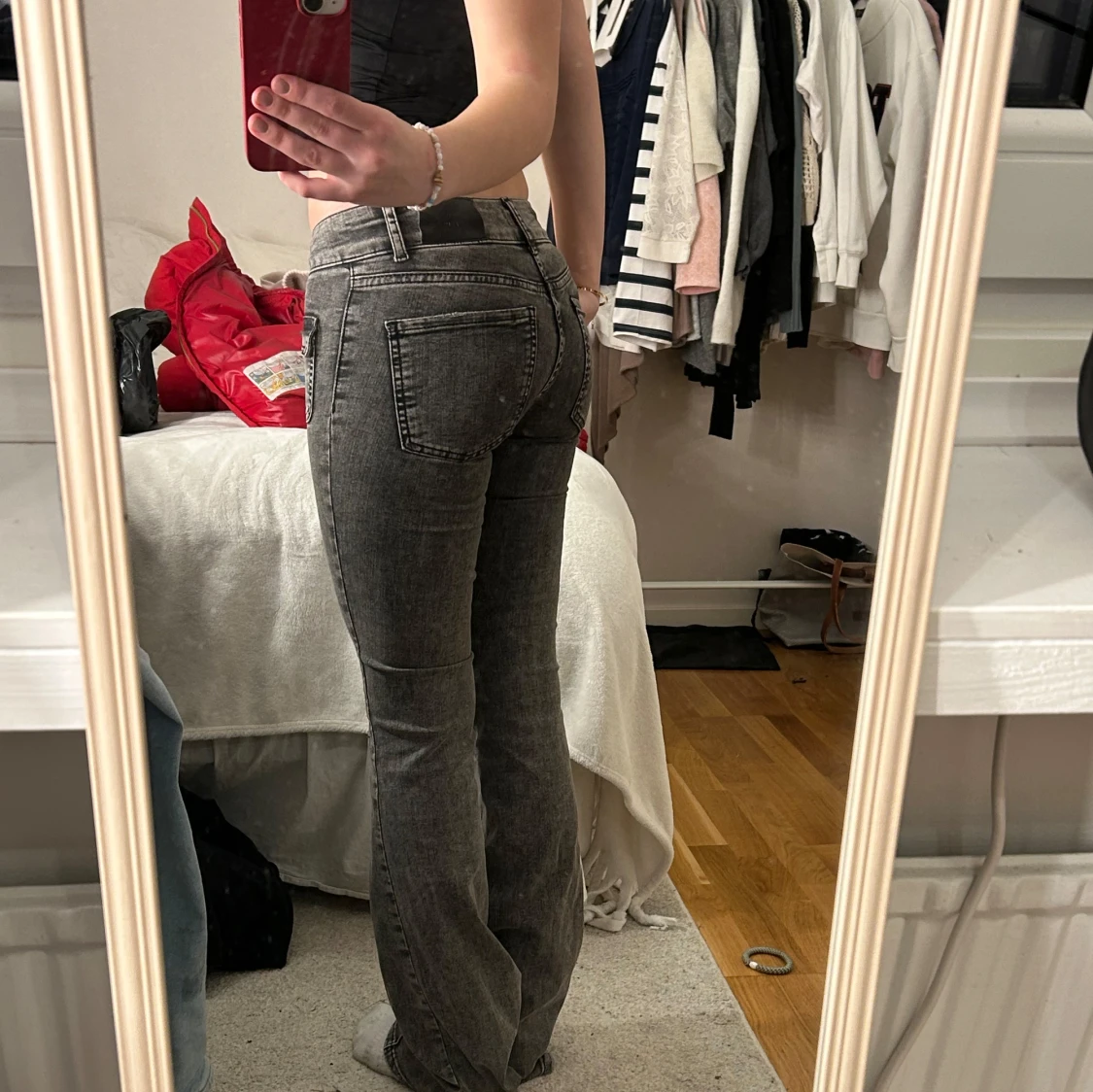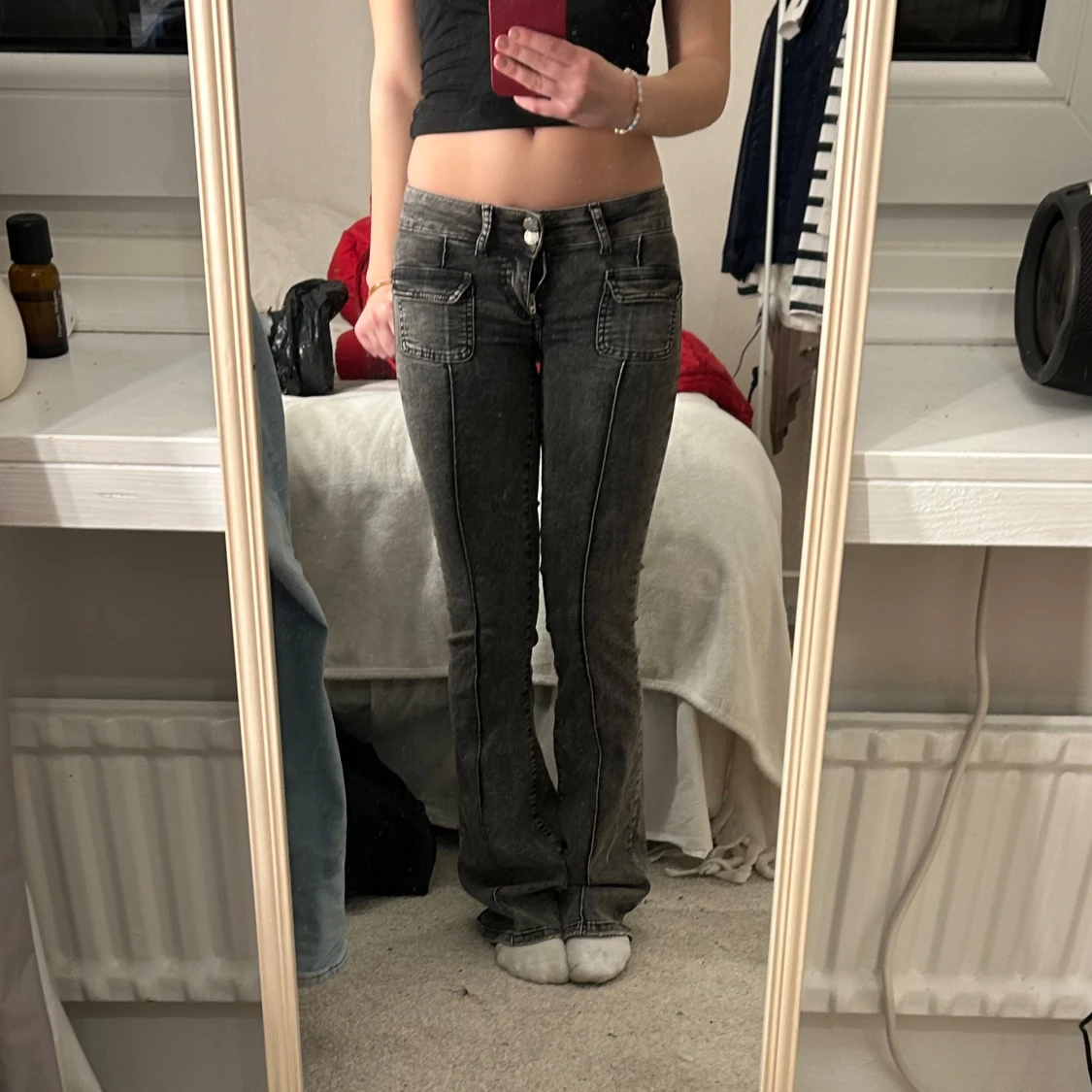 Snygga grå bootcut jeans med jätte låg midja och coola fickdetaljer fram. Perfekta för både vardag och fest🥳💕Helt nya, bara provade, kostar nya 699kr