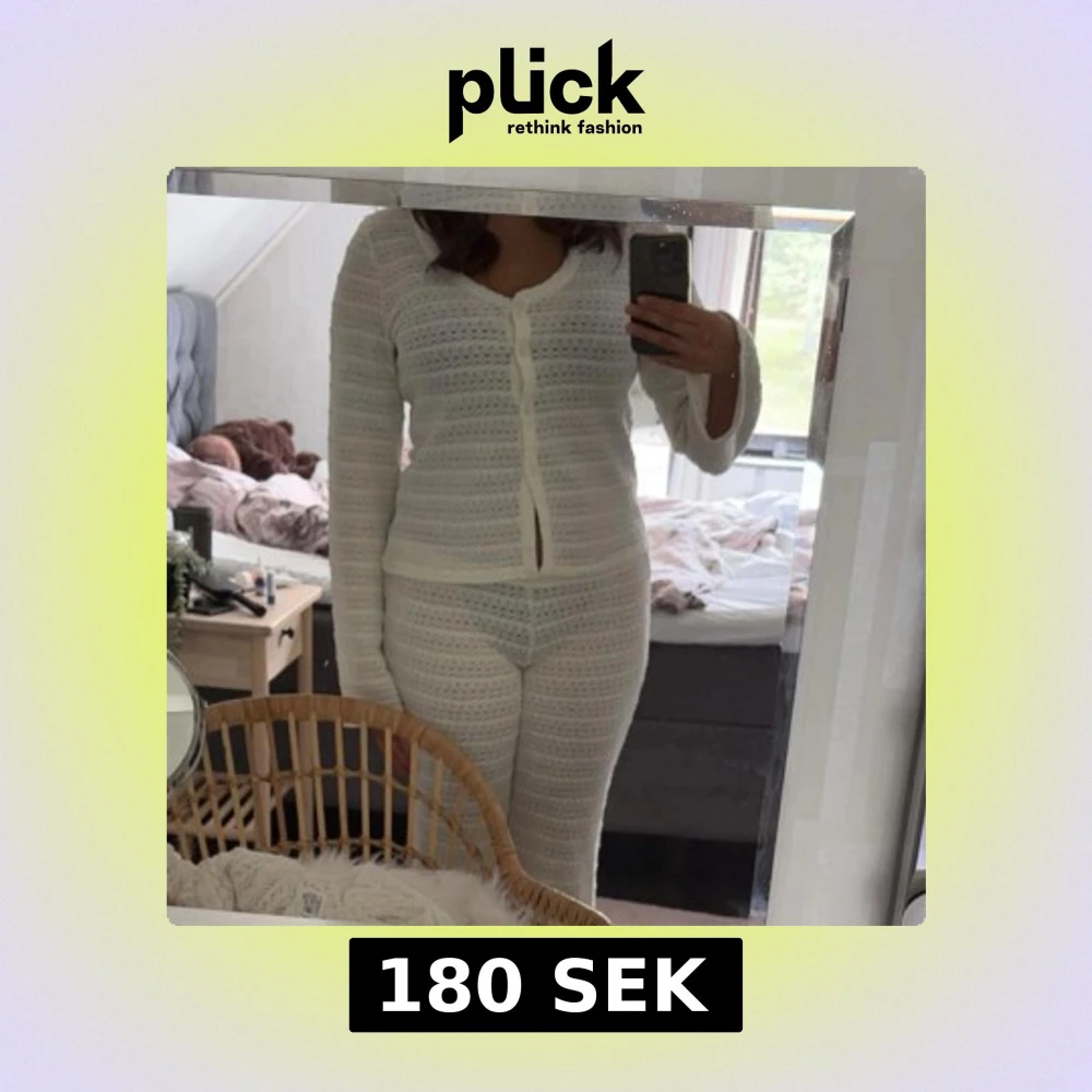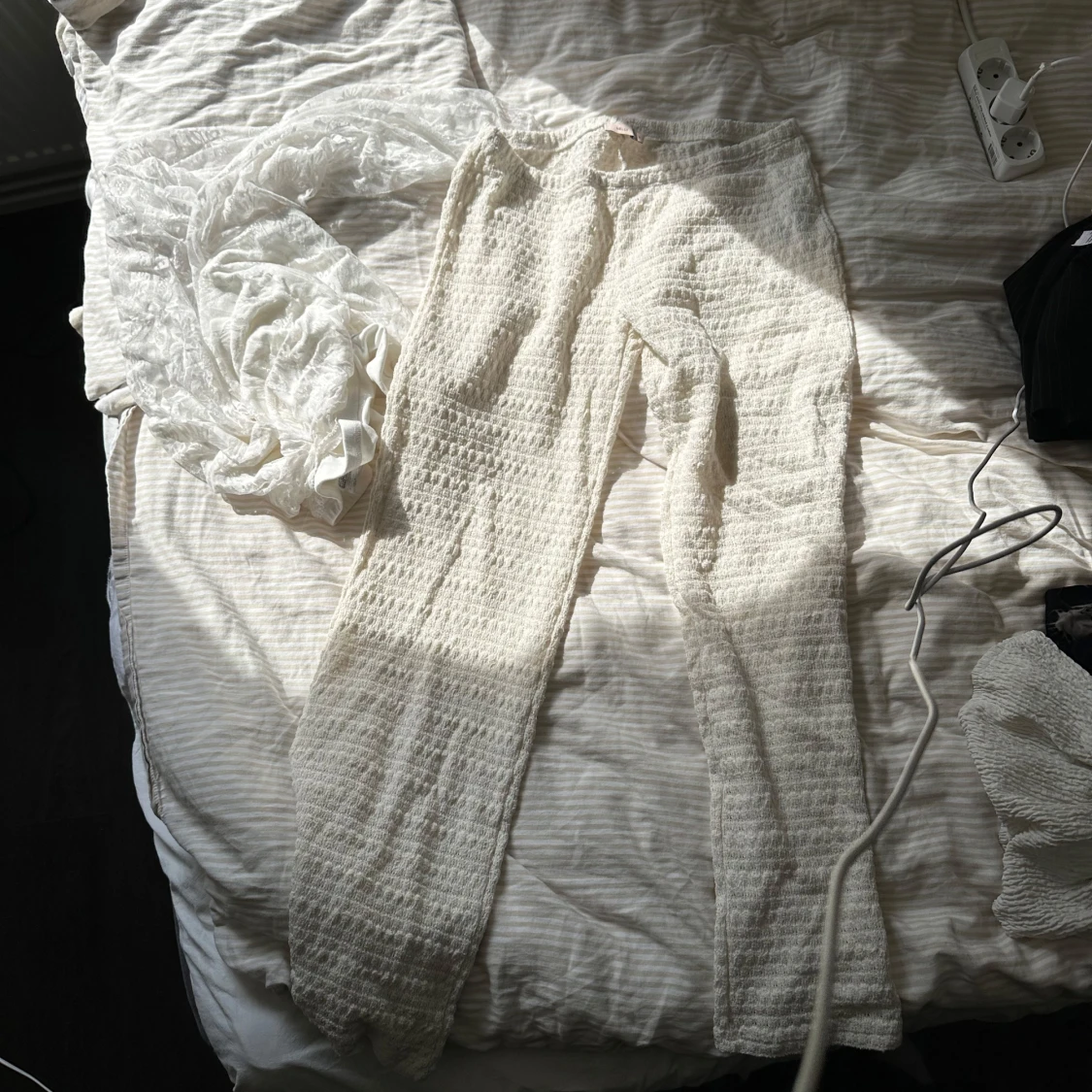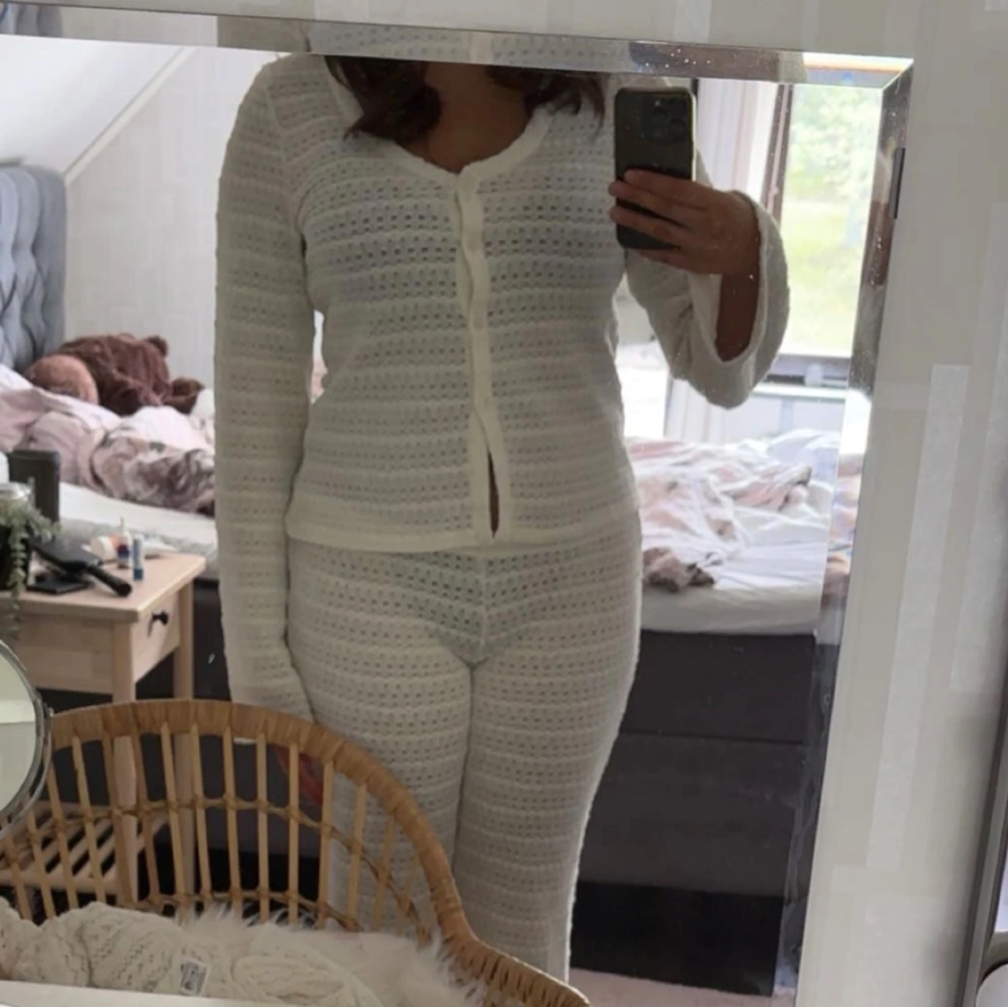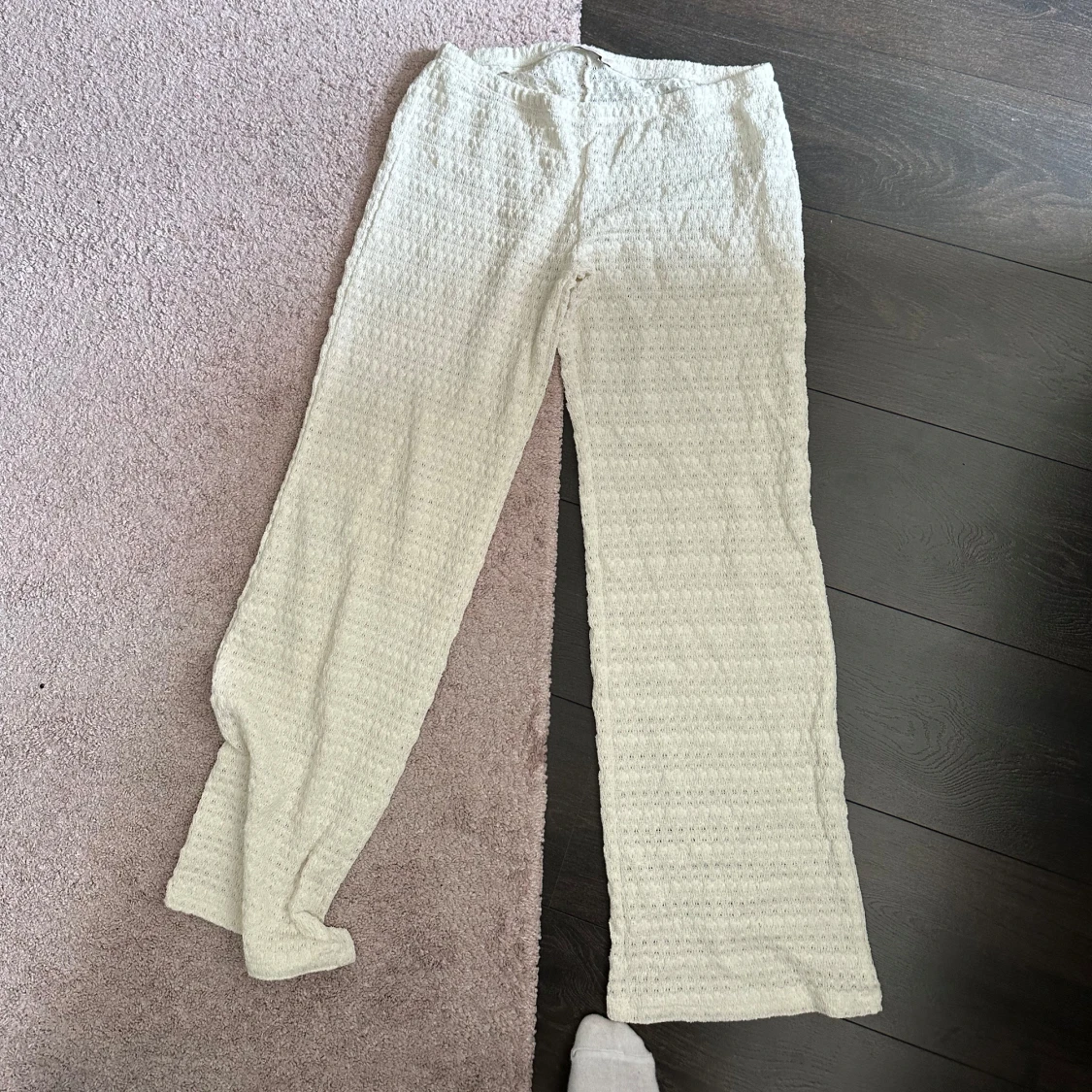 Säljer ett par vita stickade byxor med hålmönster och raka ben