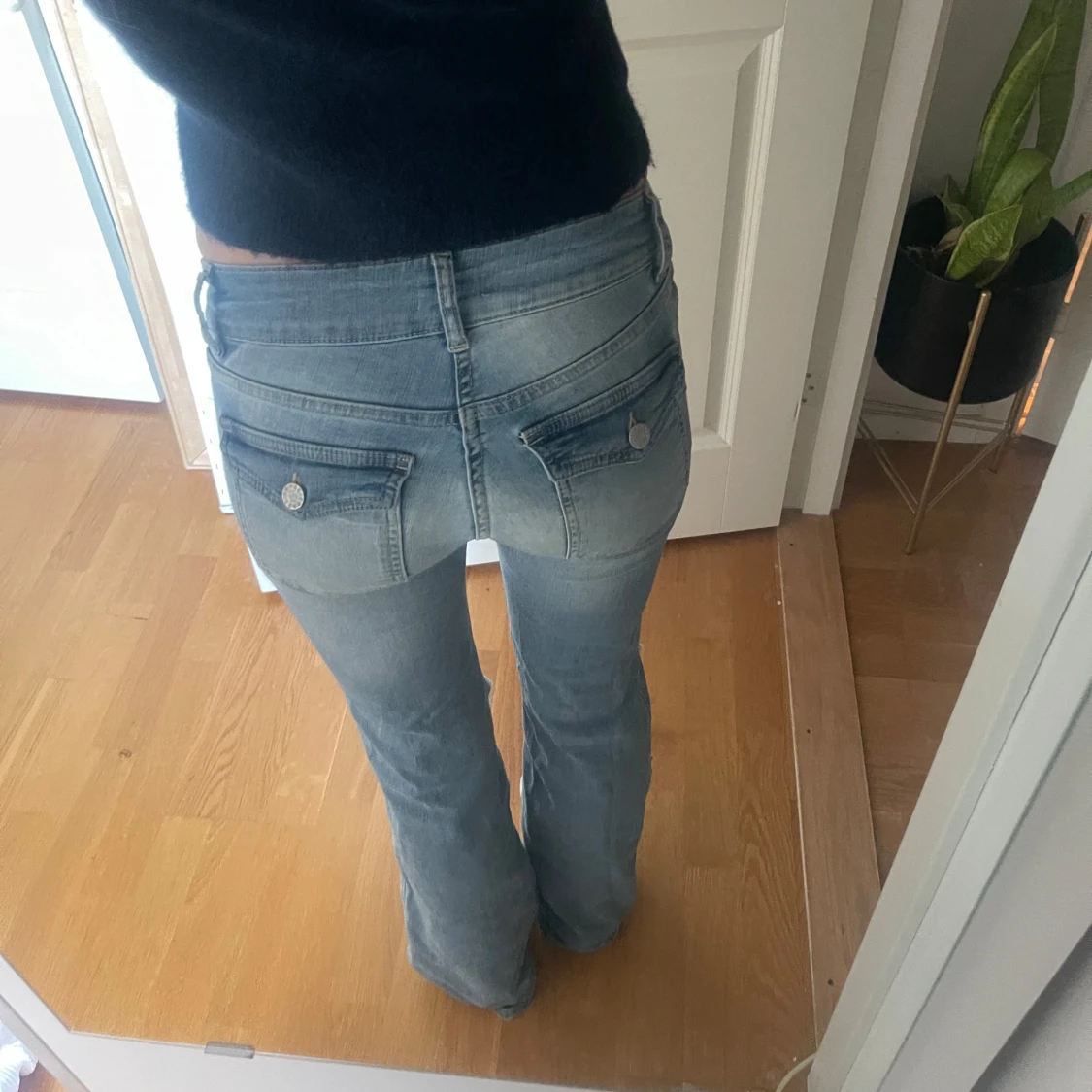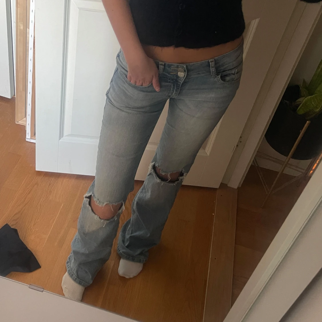 Säljer ett par ljusblå jeans med bootcut passform och slitna hål vid båda knäna. Jeansen har låg midja, klassiska fickor fram och bak med knappdetaljer på bakfickorna. (Jag är 167 cm lång och har innerbenslängd 80) Hör av dig om du undrar över något!💕