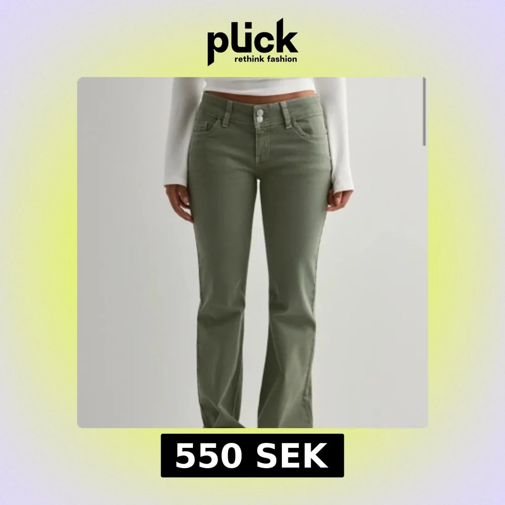 Snygga gröna lågmidjade jeans med bootcut-modell och broderade detaljer på bakfickorna. Jeansen är slutsålda och kostar 700kr nya. Säljer de för att de inte längre kommer till användning.