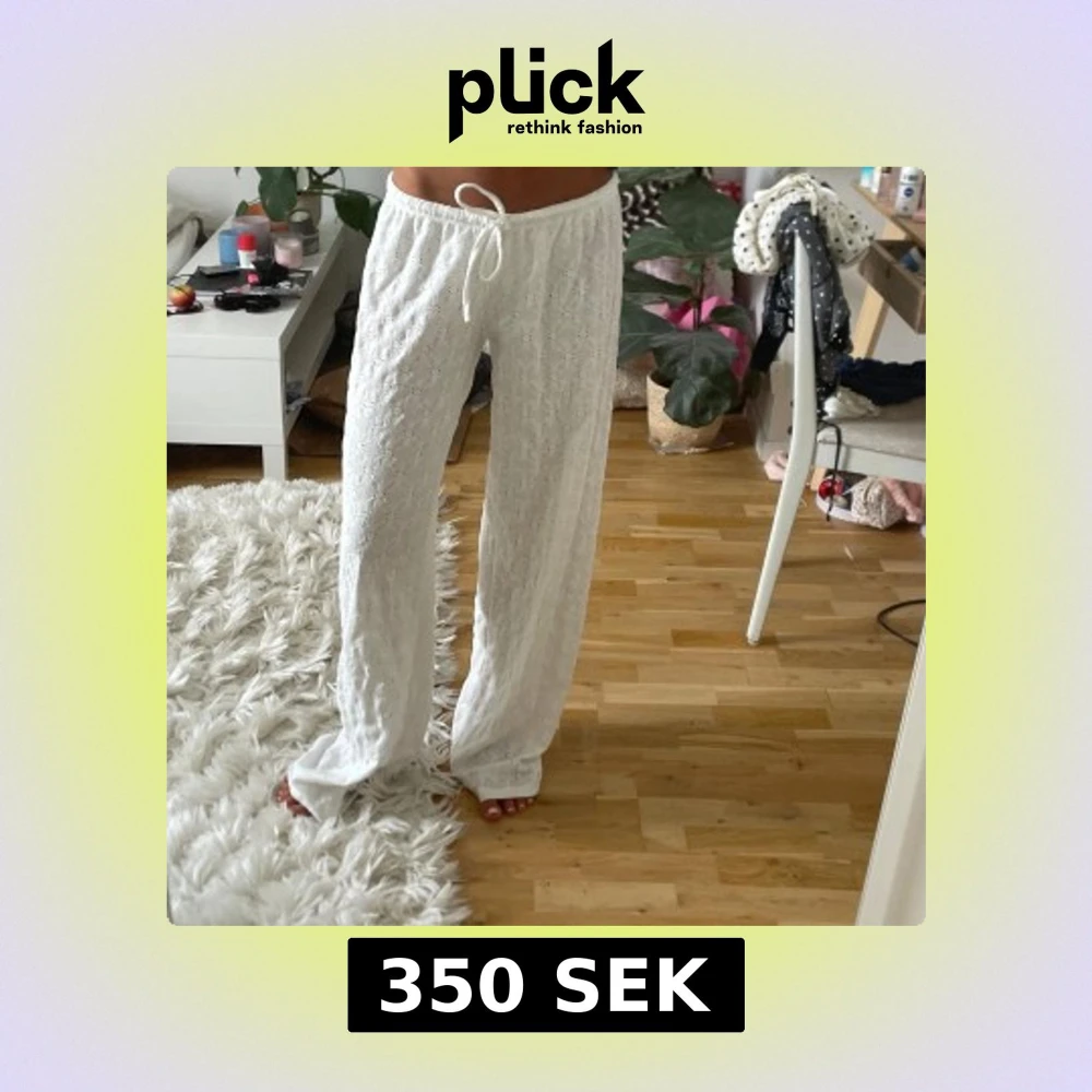 Säljer ett par vita linnebyxor/pyjamasbyxor med broderade blommor och dragsko i midjan. Byxorna har en avslappnad passform och är perfekta för varma dagar. Lätta och luftiga med snyggt hålmönster som ger en chill vibe.
