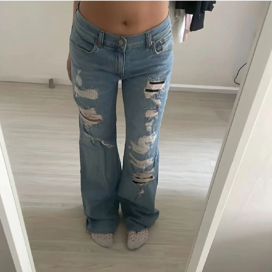 Säljer ett par ljusblå jeans med rejält slitna detaljer och hål på båda benen. Modellen är bootcut med utsvängda ben och normal midja. Perfekta för en avslappnad och trendig look.