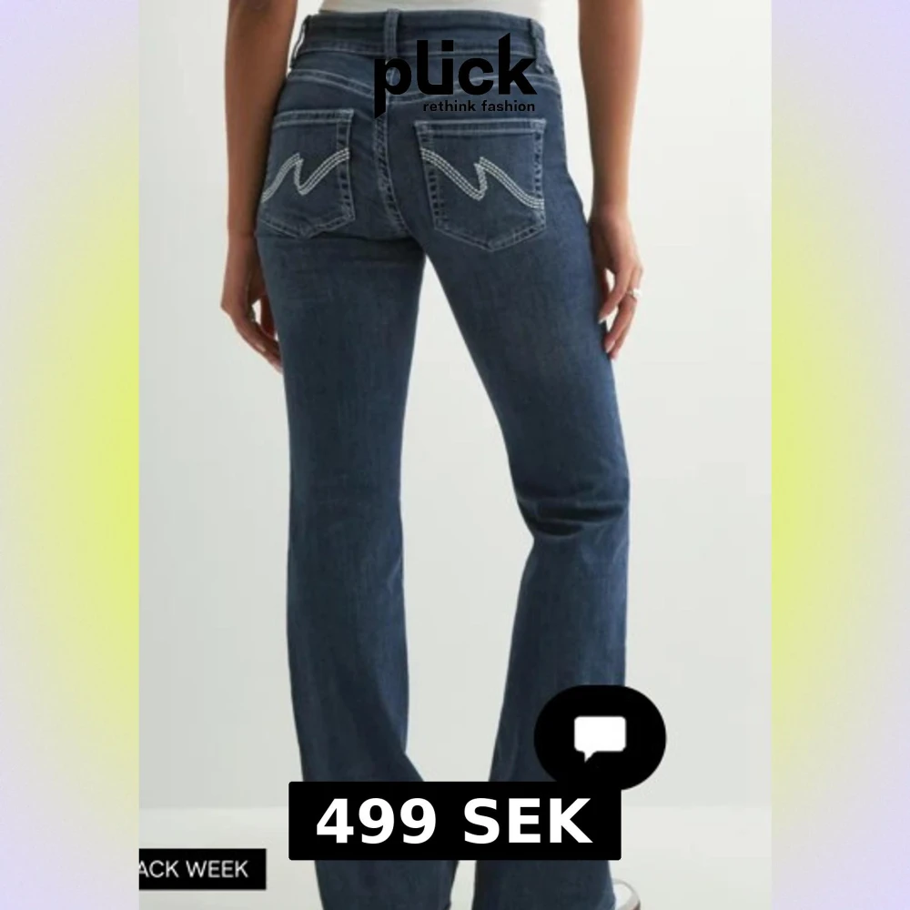 Snygga blå bootcut jeans med coolt vitt broderi på bakfickorna. Perfekt passform med lite utsvängda ben och normal midja. Materialet är slitstarkt jeans. Storlek 32.