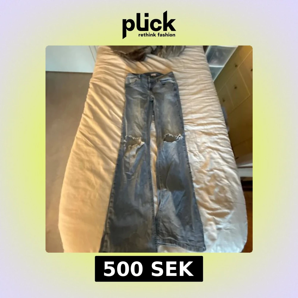 Säljer ett par ljusblå jeans från nelly som är bootcut/flare💕dem passar inte mig så fint längre och kommer inte till användning längre är fortfarande bra kvalitet men på en av hållen så har hållet blivit större(kolla på bilden med röd cirkel) passar mig som e 176 i längd, orginal pris är 700kr men säljer för 500kr,skriv till mig privat om det är mågra funderingar❤️