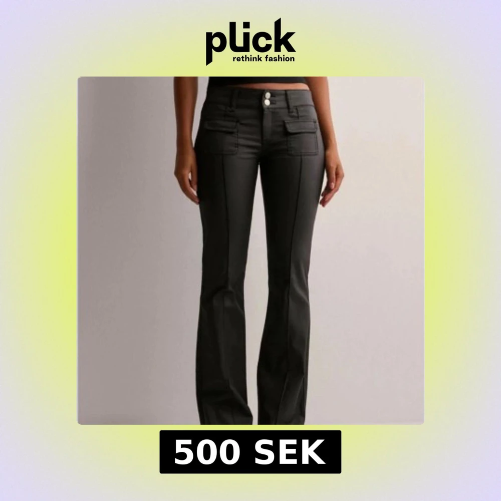 Snygga svarta bootcut byxor med två framfickor och dubbla knappar i midjan. Byxorna har en stilren look och markerade sömmar framtill. Perfekta för dig som vill ha en trendig och tidlös stil. Slutsålda nypris:699kr