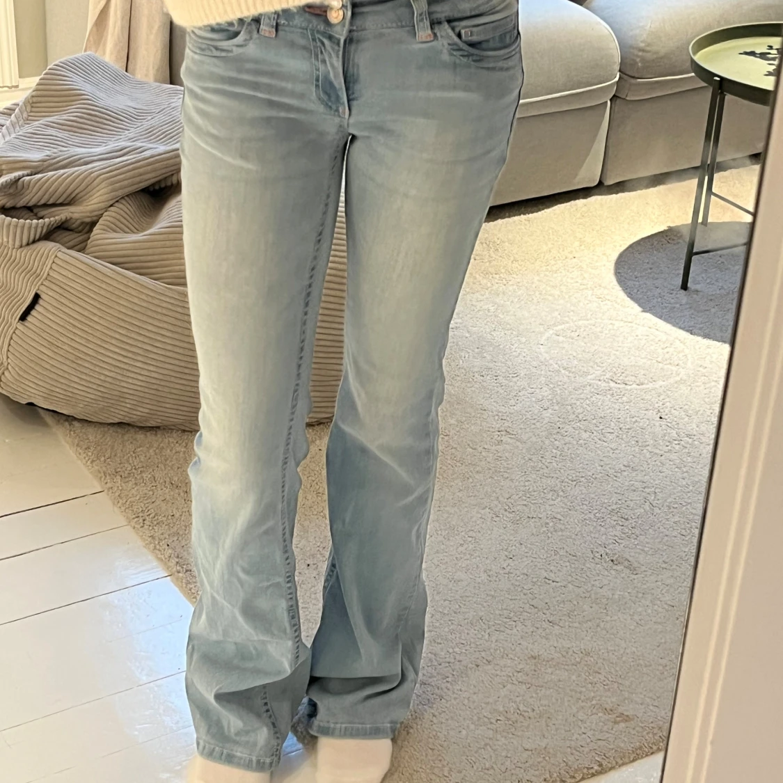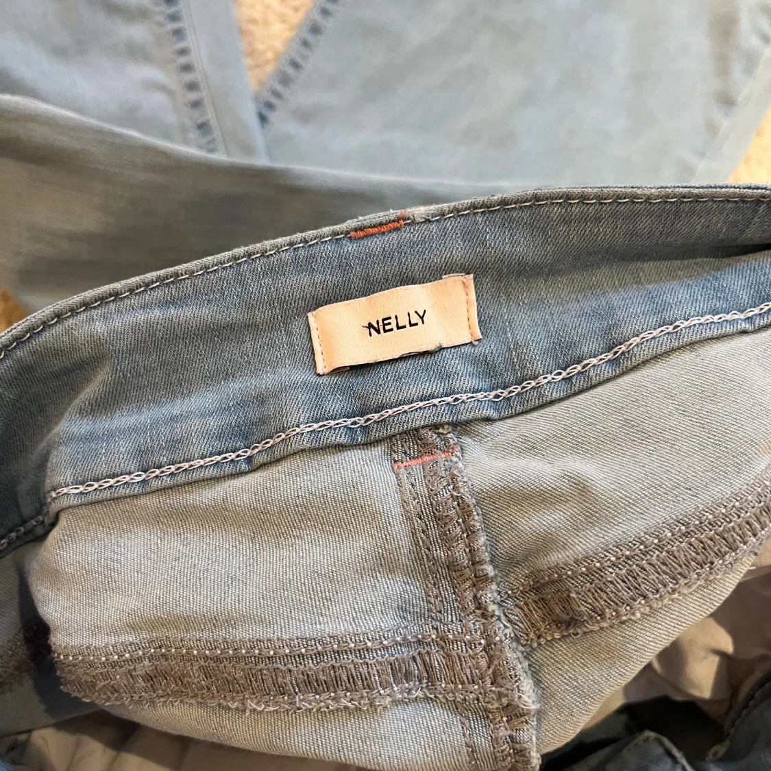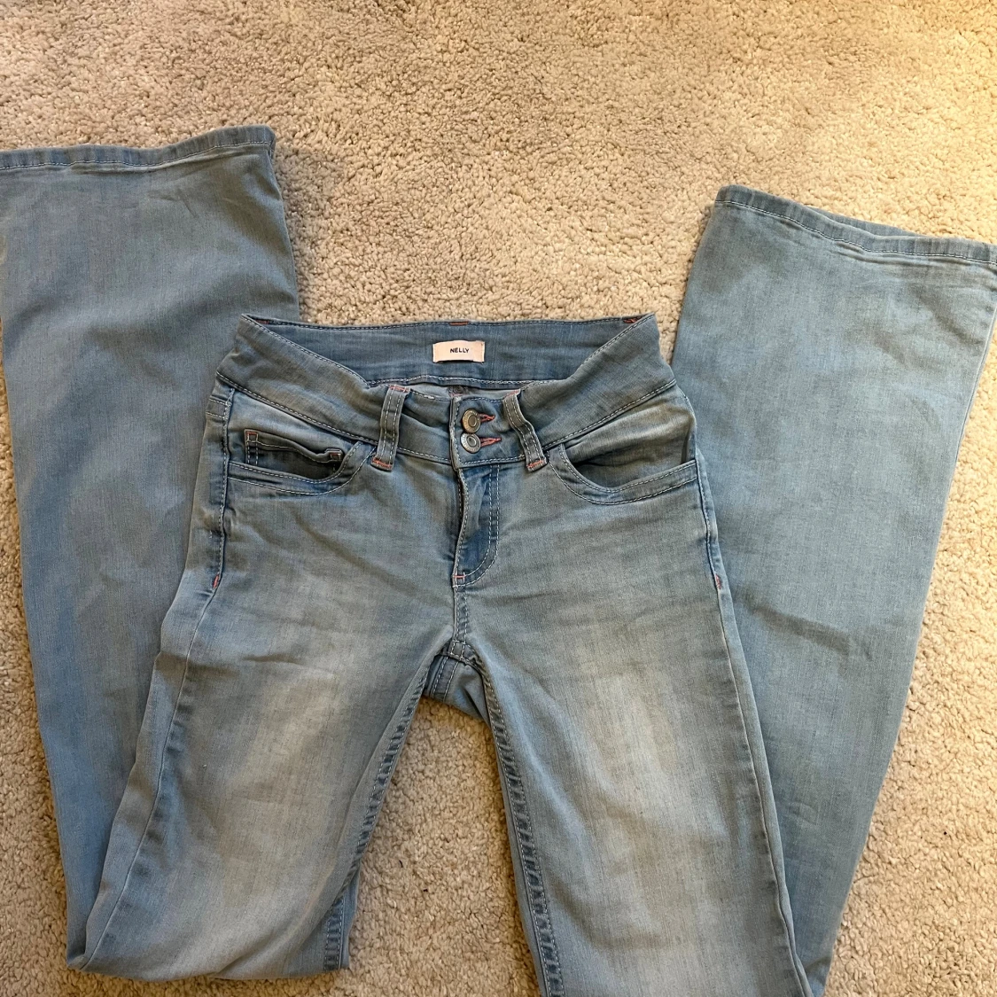 Snygga ljusblå jeans från Nelly med bootcut passform och klassisk femficksdesign. Jeansen har rosa broderade detaljer på bakfickorna och dubbla knappar i midjan.