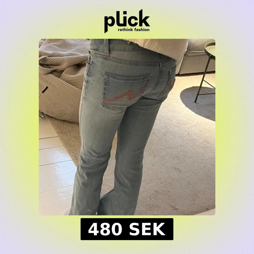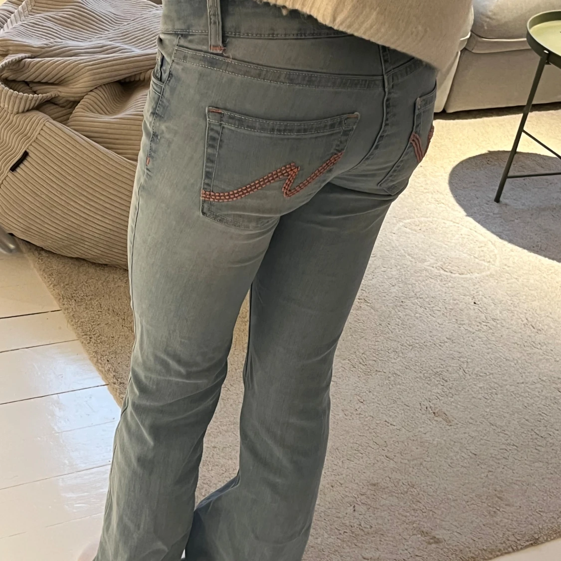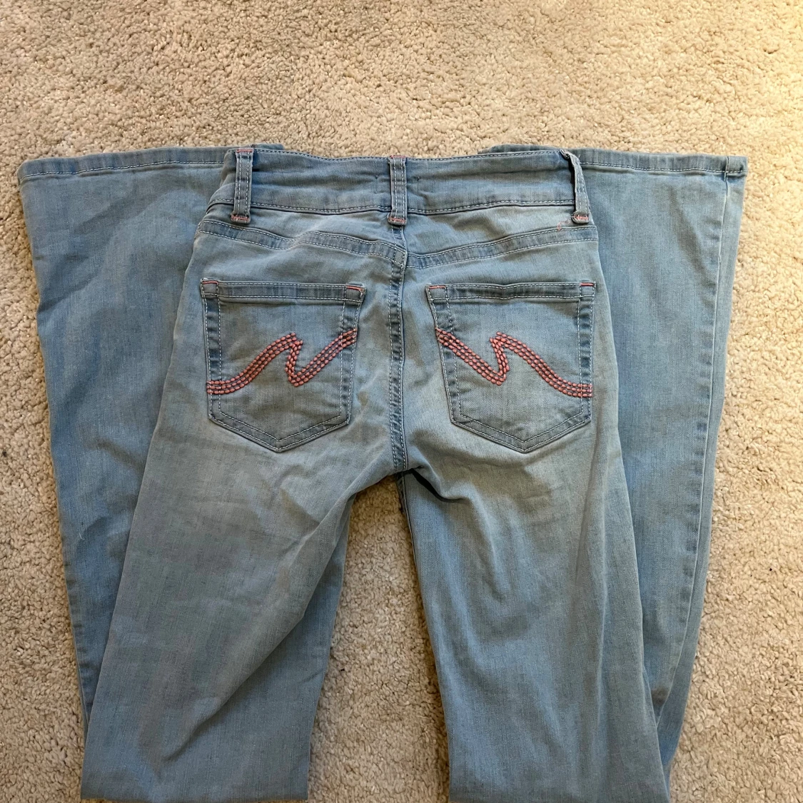 Snygga ljusblå jeans från Nelly med bootcut passform och klassisk femficksdesign. Jeansen har rosa broderade detaljer på bakfickorna och dubbla knappar i midjan.