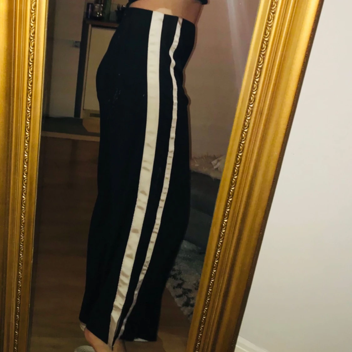 Vida byxor i svart med ljusrosa streck på sidan. En liten slits längst ner i benslutet. Bara provade.