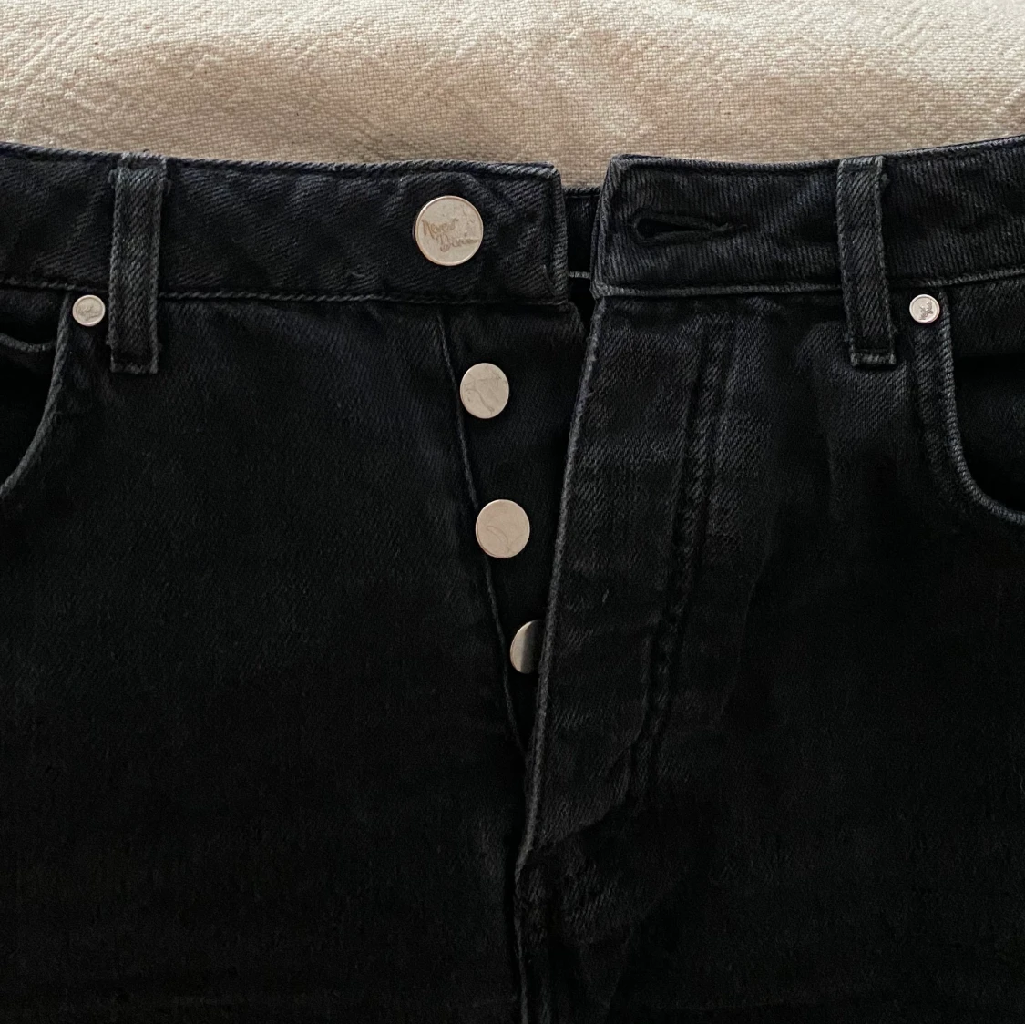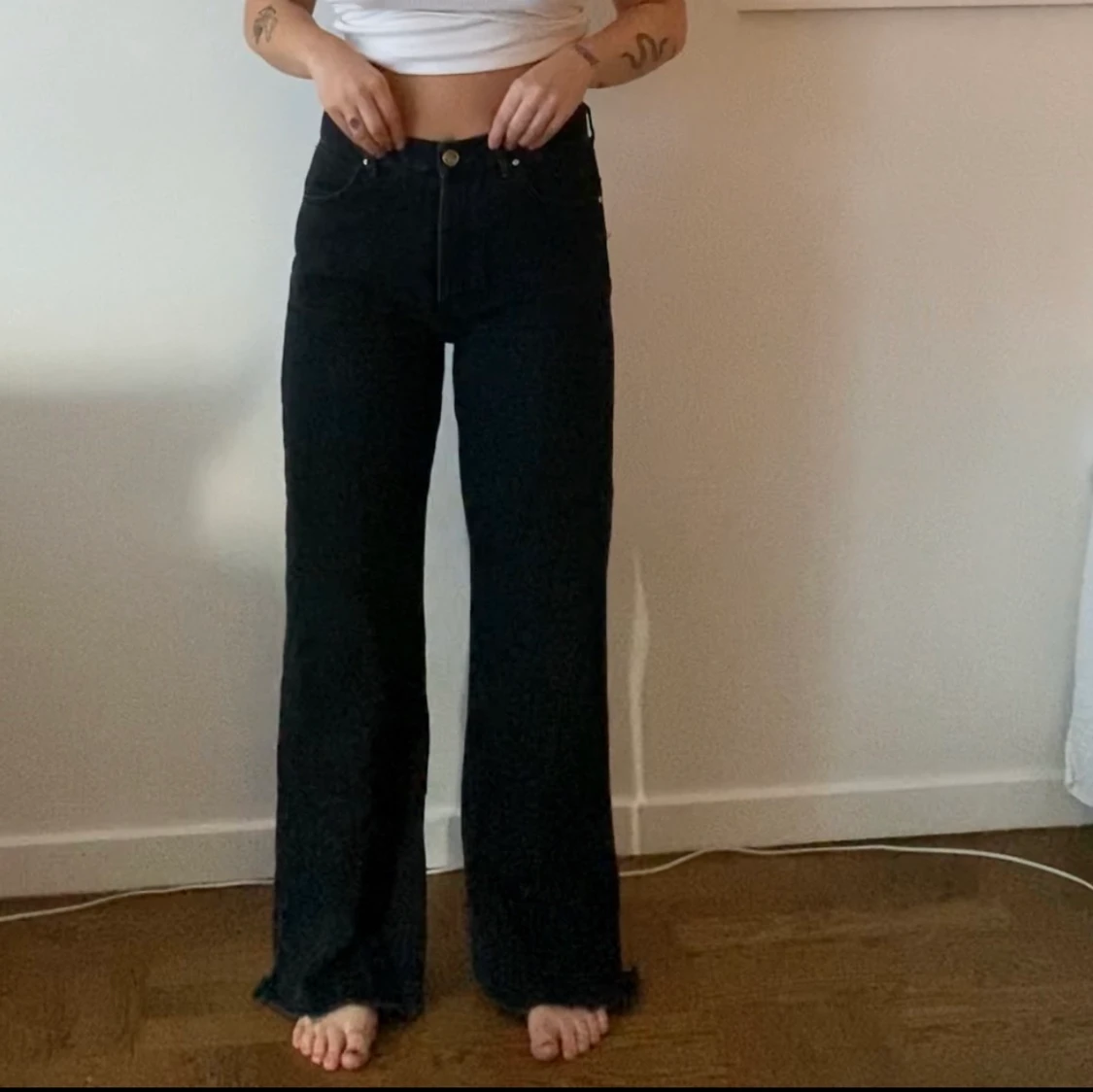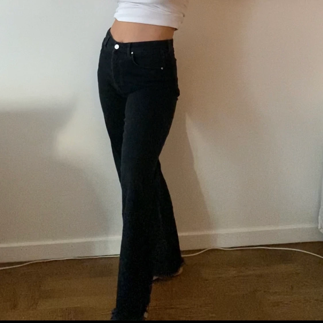 Svarta utsvĂ€ngda jeans frĂ„n Never Denim! Lite fransat lĂ€ngst ner! đ€ Ăr 160 cm lĂ„ng, dom Ă€r en gnutta för lĂ„nga pĂ„ mig men med höga skor blir dom perfekta!â€ïž