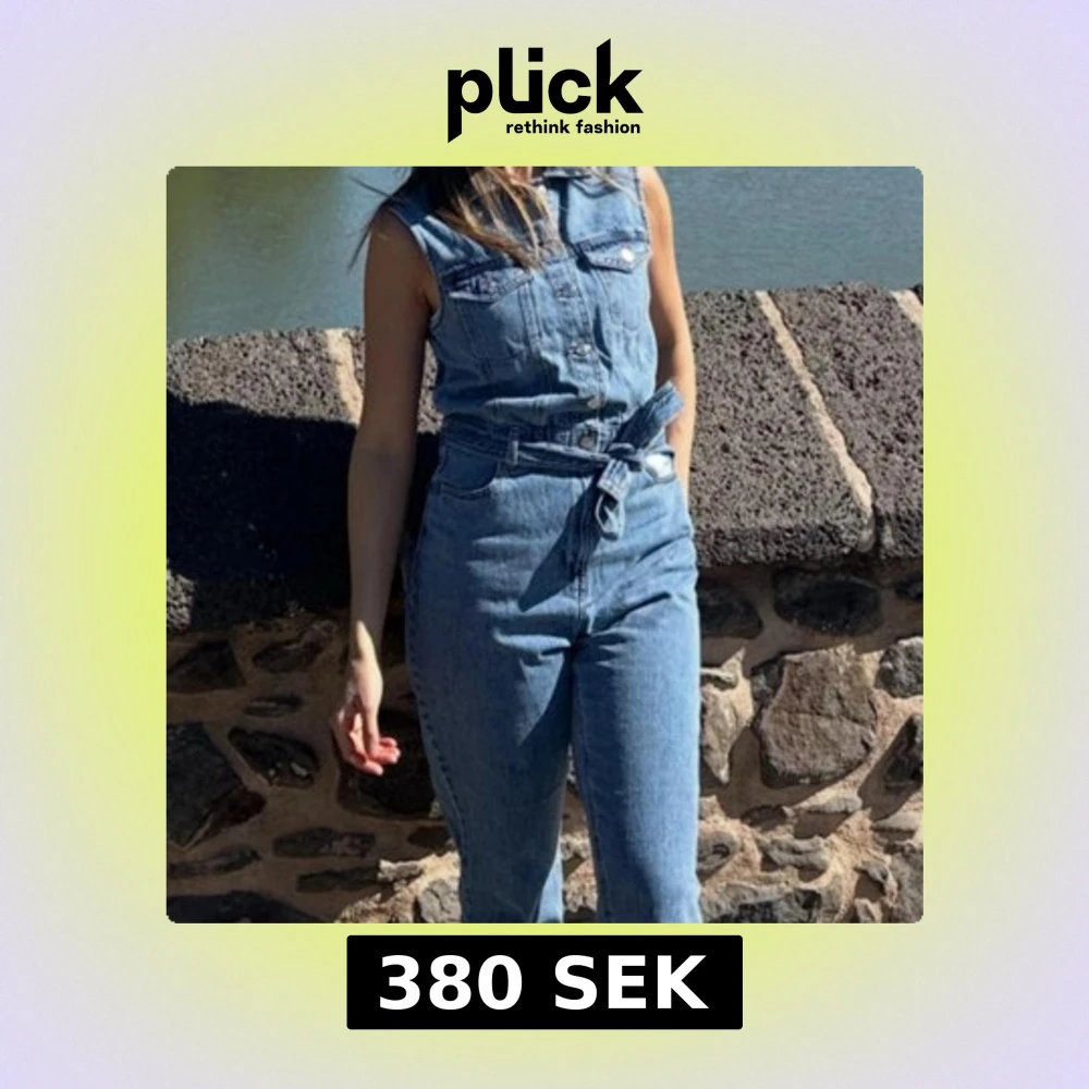 Snygg ärmlös byxdress i ljusblå denim med knytband i midjan och klassiska jeansdetaljer som bröstfickor och krage. Perfekt för dig som vill ha en cool och avslappnad look med edge. Använd en gång. Nypris: 419 kr