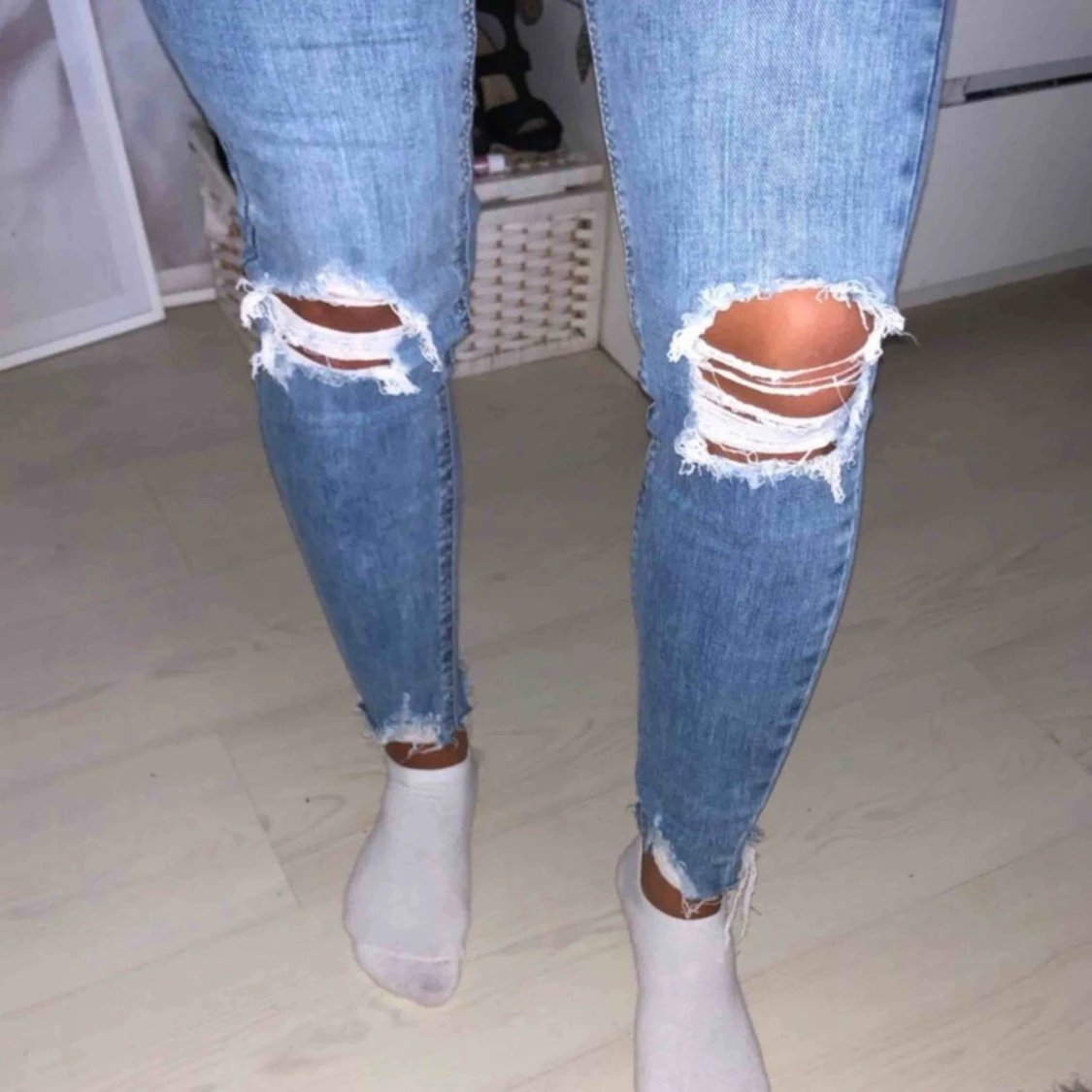 Snygga högmidjade jeans från New Look med modellen Jenna. Slitningar i knäna samt längst ner vid jeansen, aldrig använda och endast testade, säljer pga de inte riktigt passar mig. Storlek: 38 men passar nog även 36