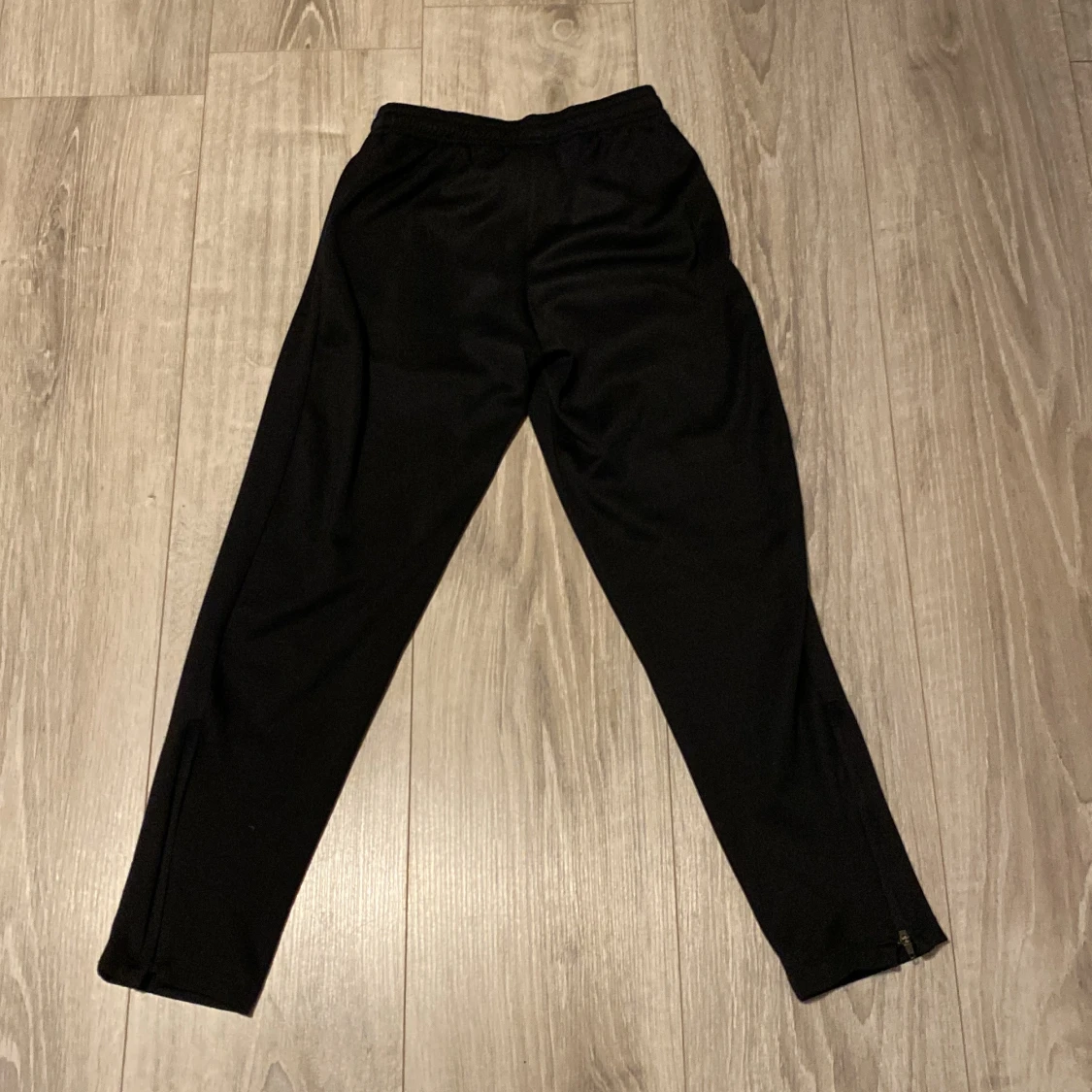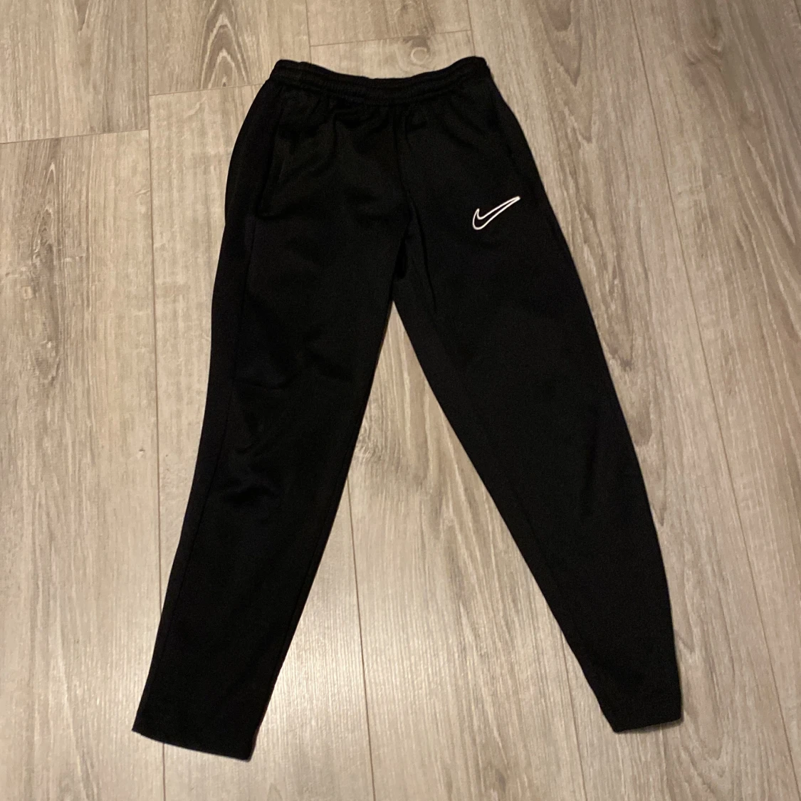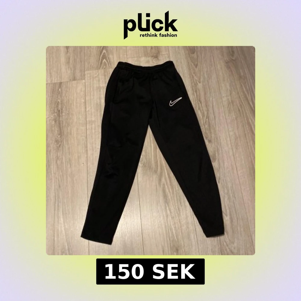 Svarta mjukisbyxor från Nike med Dri-FIT-teknologi. Byxorna har en elastisk midja, smal passform och dragkedjor vid bensluten. Nike-logga på ena benet. Perfekta för träning eller chill. Tveka inte på att höra av dig runt priset, inga defekter.