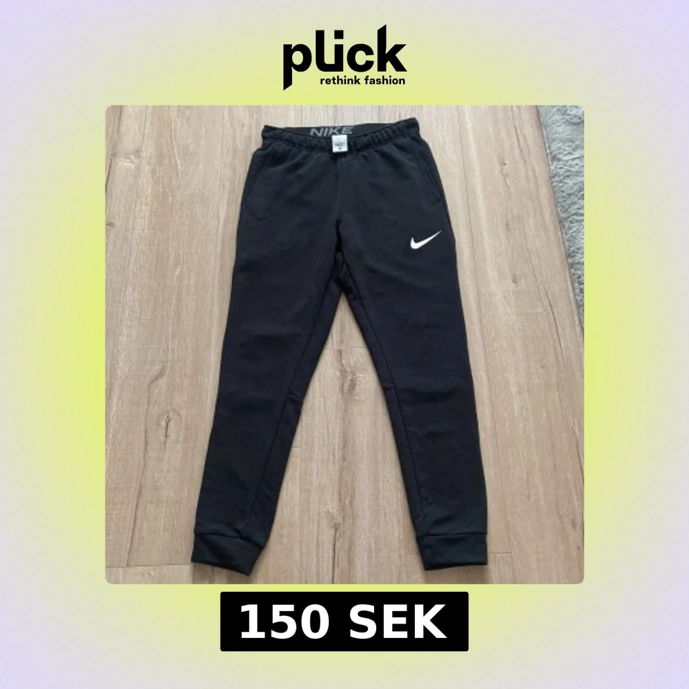 Svarta mjukisbyxor från Nike med Dri-FIT-material och elastisk midja. Byxorna har en smal passform och klassisk Nike-logga på ena benet. Perfekta för träning eller chill. Säljes i storlek S.