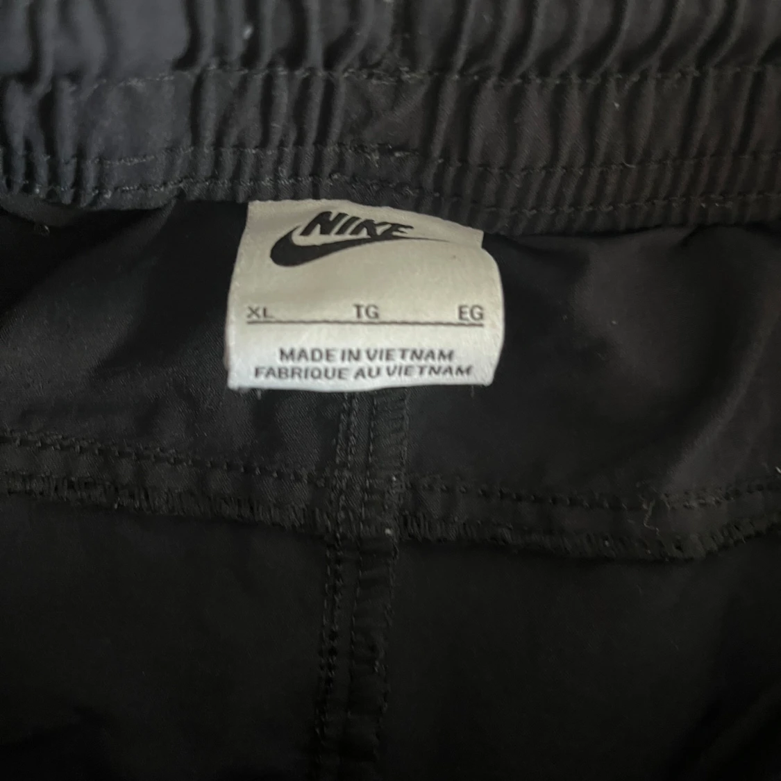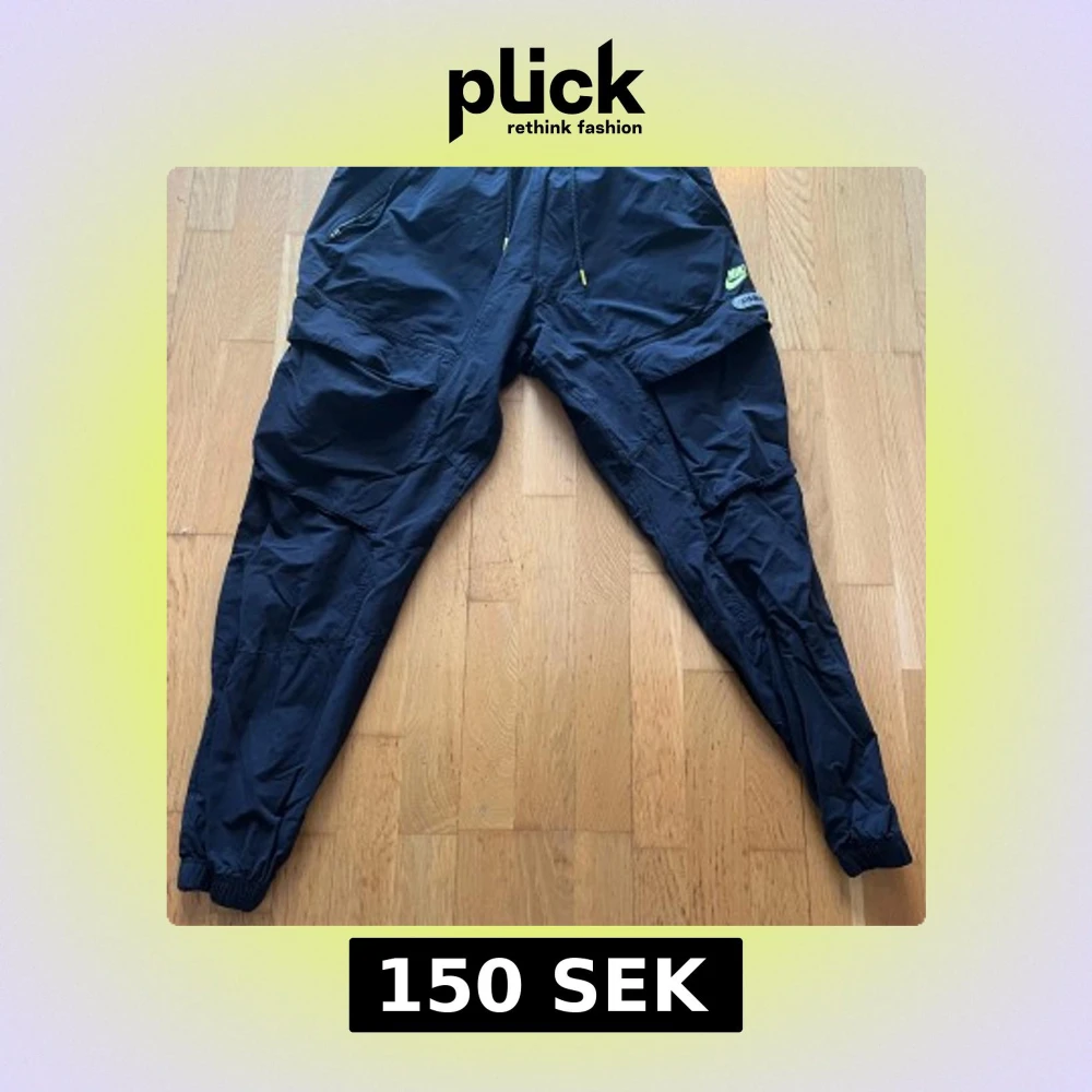 Säljer ett par svarta träningsbyxor från Nike med elastisk midja och flera praktiska fickor. Byxorna har en avslappnad passform och är perfekta för sportiga aktiviteter. Nike-loggan syns tydligt på sidan.
