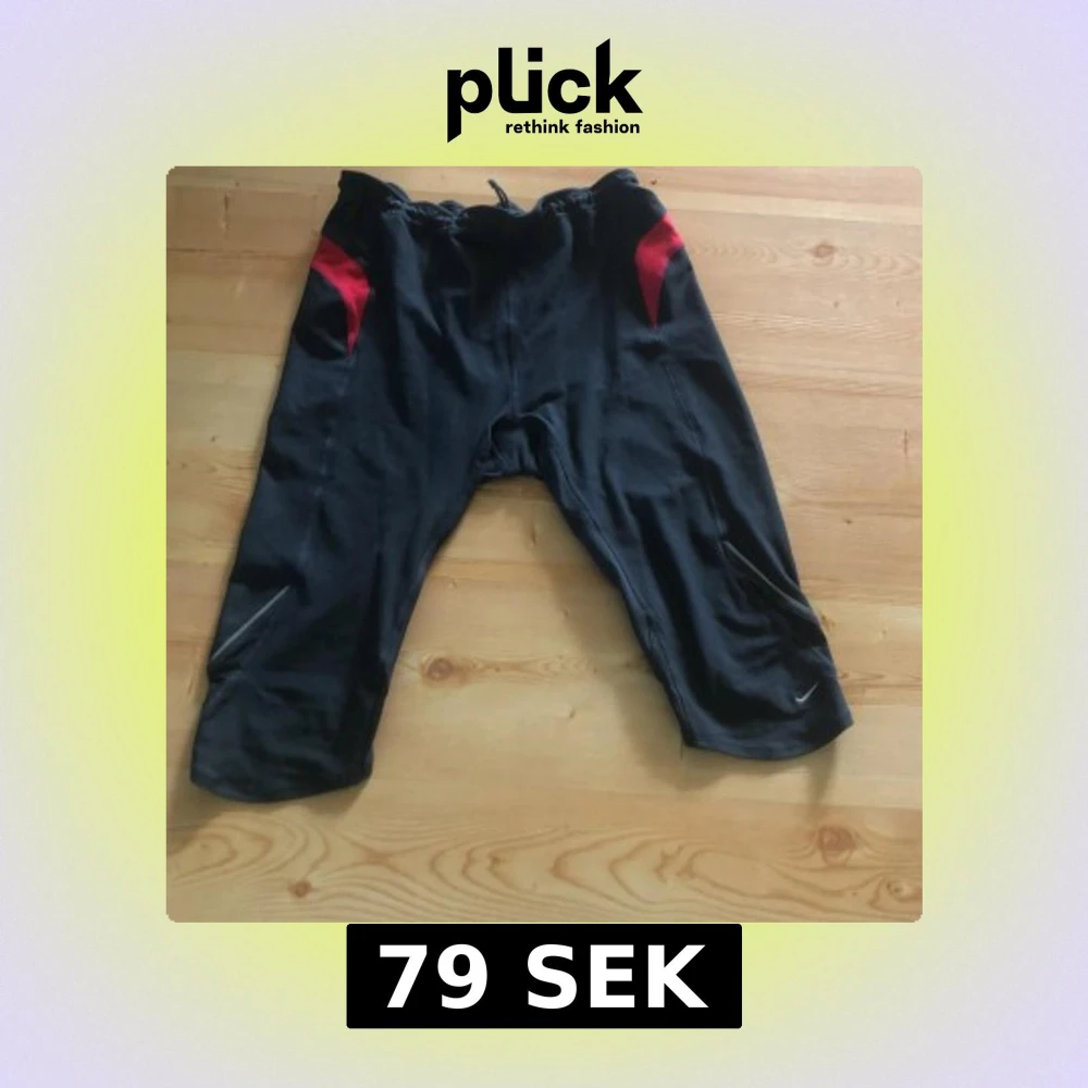 Svarta Nike FIT träningsbyxor i trekvartsmodell med röda detaljer och reflexdetaljer vid benen. Byxorna har en smal passform och är gjorda i ett syntetmaterial som andas, perfekt för löpning eller gym. Bakficka med dragkedja för småsaker. Känns som medium.