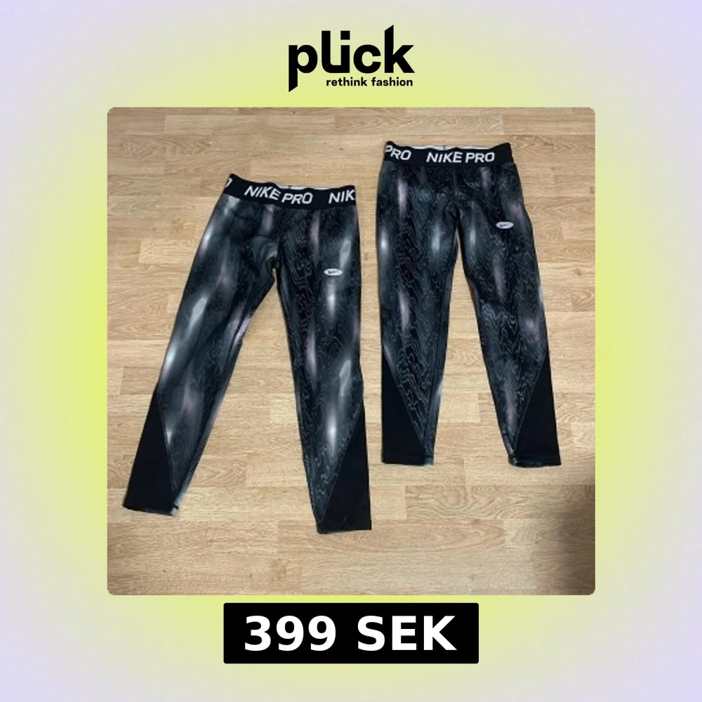 Nike Pro leggings i svart med coolt vågigt mönster och bred resår i midjan med logga. Sitter tight och är perfekta för träning. Materialet är stretchigt och andas, vilket gör dem riktigt sköna att ha på sig. De är helt oanvända bara påprovade. Dem är storlek L fast i barn storlek.Kontakta mig om ni bara vill ha ena paret❣️dem kostar 199kr styck, men priset kan diskuteras.