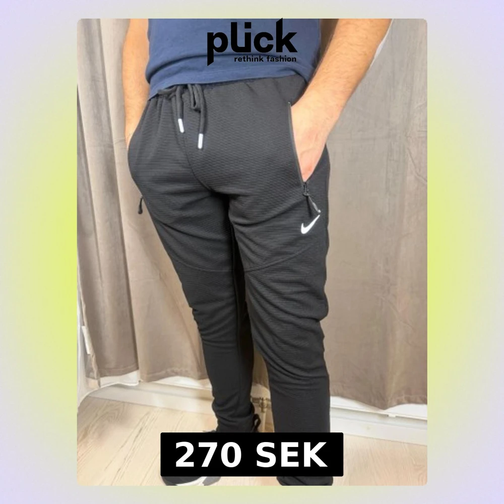 Säljer ett par svarta mjukisbyxor från Nike med vit logga på låret. Byxorna har dragsko i midjan, dragkedjor vid fickorna och är tillverkade i ett ribbat syntetmaterial. Passformen är slim och de är perfekta för träning eller chill.