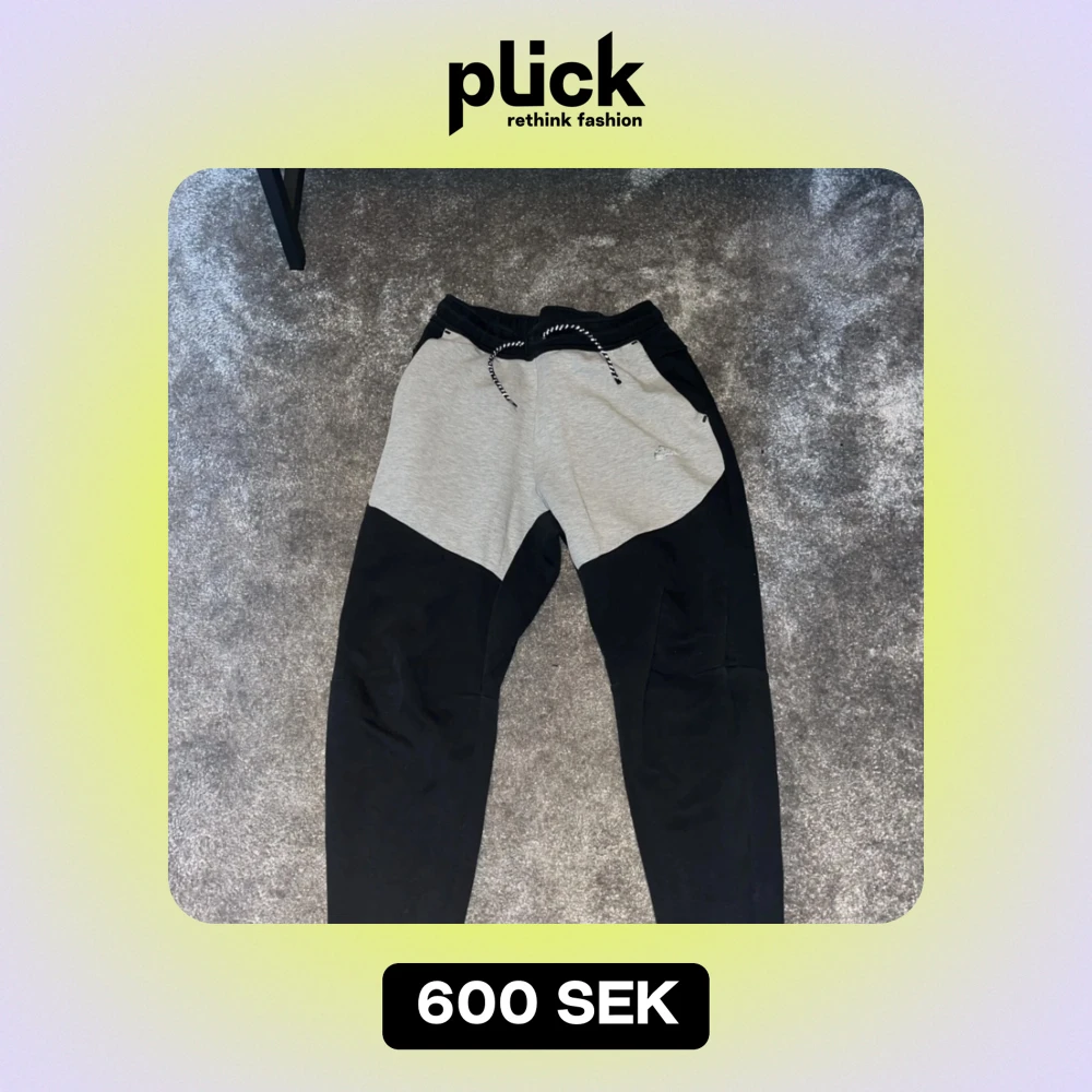 Säljer ett par grå och svarta mjukisbyxor från Nike. De har en bekväm passform med snörning i midjan och en liten Nike-logga på sidan. Perfekta för chill dagar eller träning. 🖤