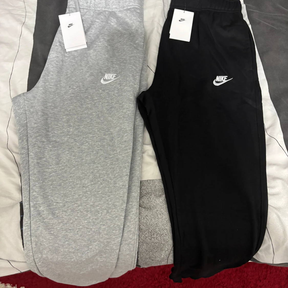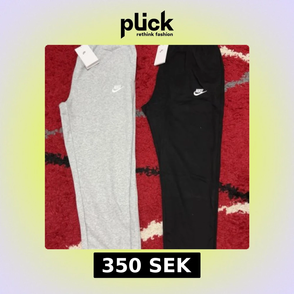 Två par mjukisbyxor från Nike, ena i ljusgrått och andra i svart. Båda har klassisk Nike-logga på låret och elastisk midja för skön passform. Perfekta för chill eller träning, tillverkade i mjukt bomullsmaterial. Snygg och enkel design som funkar till allt. 350 för en