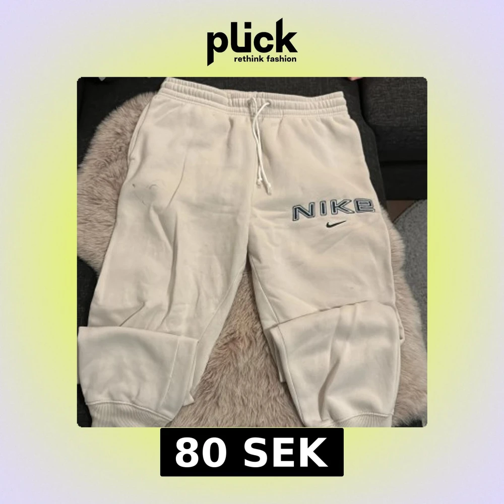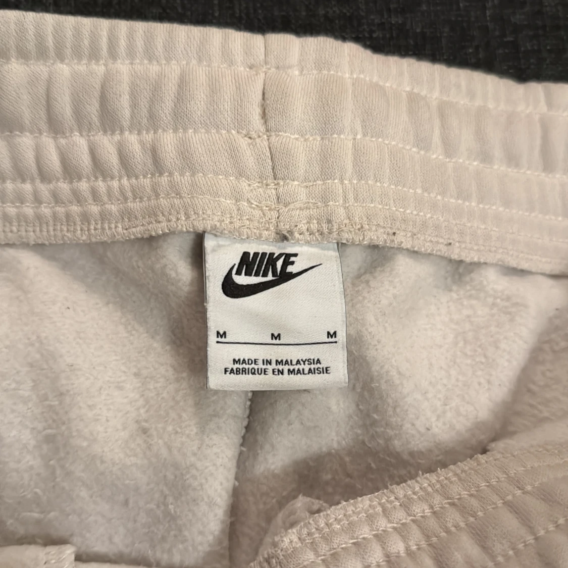 Snygga vita mjukisbyxor från Nike i storlek M med broderad logga på ena benet. Byxorna har resår och snörning i midjan samt muddar vid bensluten. Tillverkade i mjukt material som är skönt mot huden. Perfekta för chill eller träning. Använt ett fåtalet gånger.